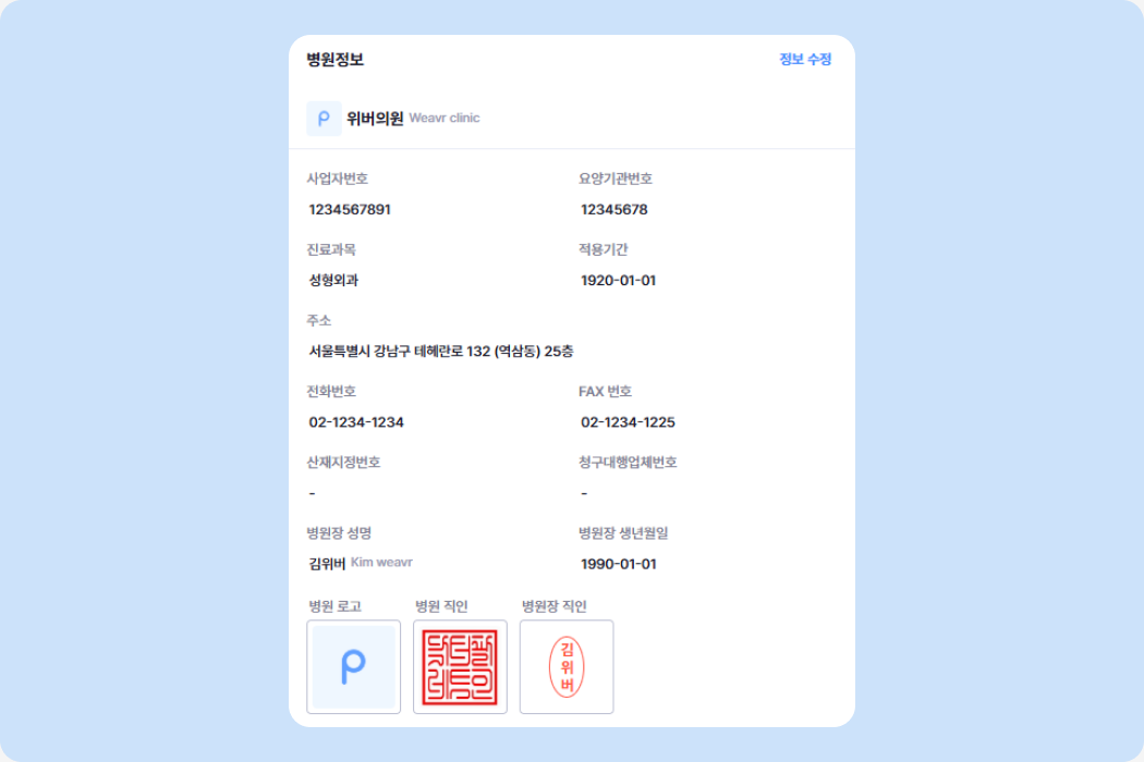 각종 문서와 행정 업무에 필요한 우리 병원의 정보와 직인을 등록할 수 있어요.