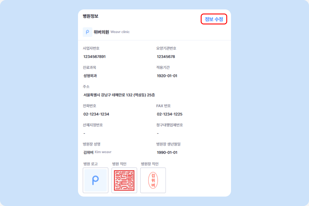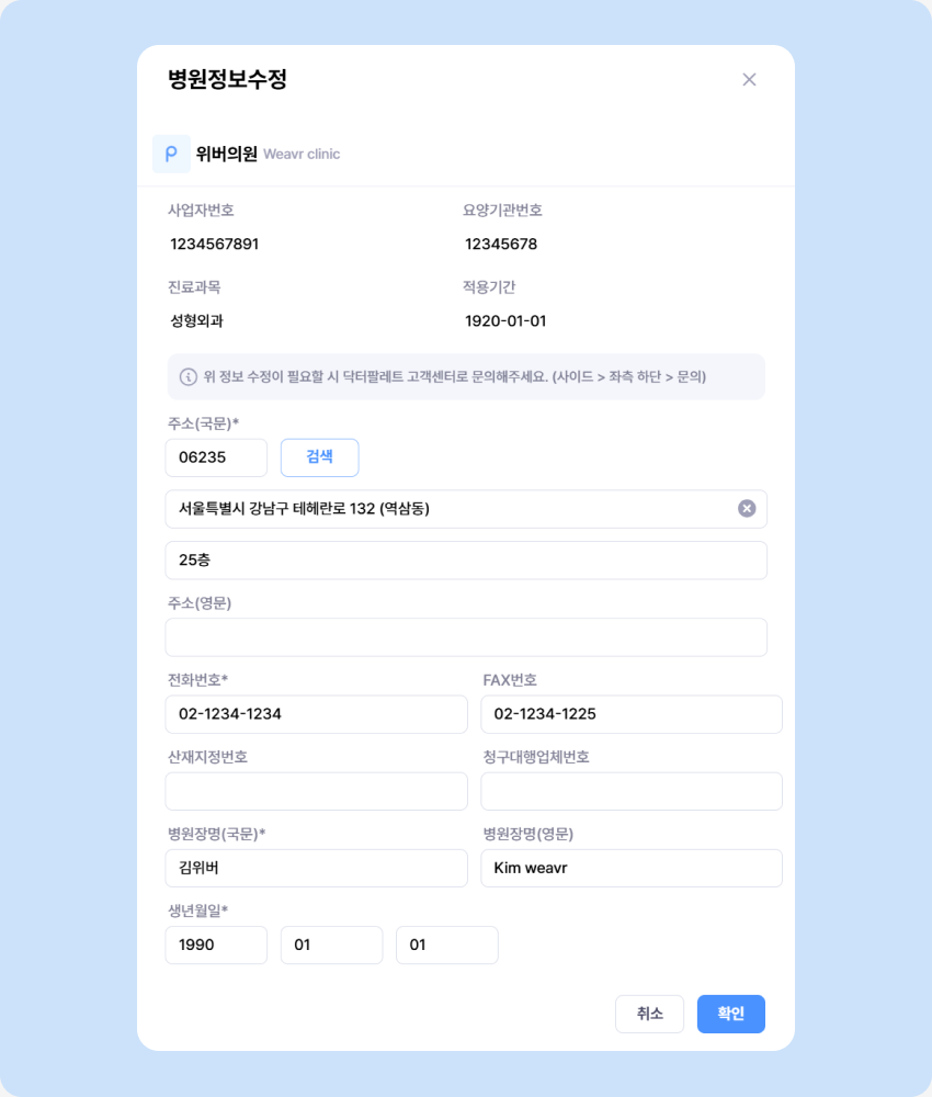 🚨 의료기관 정보(사업자번호, 요양기관기호)가 변경되었다면, 고객센터로 연락해주세요!