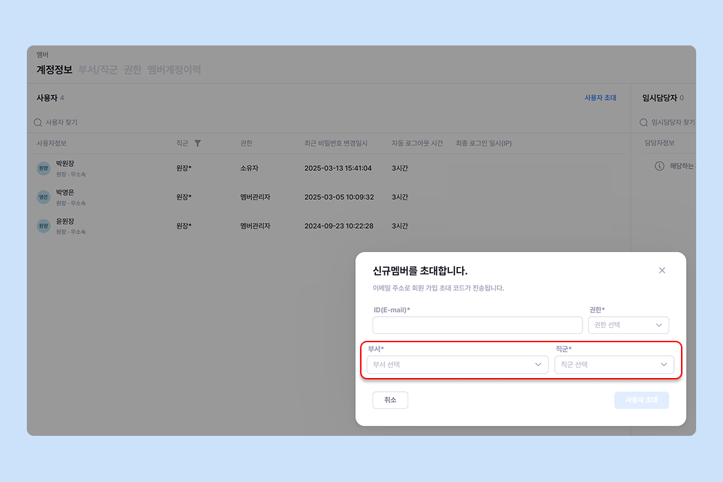 부서와 직군은 새로운 계정을 초대할 때 선택할 수 있어요.