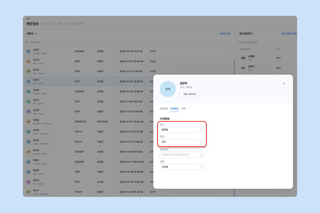 이미 가입한 계정이라도 부서와 직군을 수정할 수 있어요.