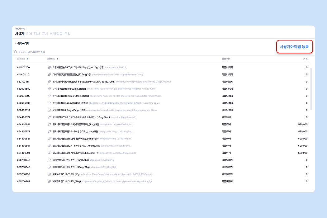 비급여 수가아이템의 경우 팔레트에 먼저 등록해야 처방할 수 있어요.