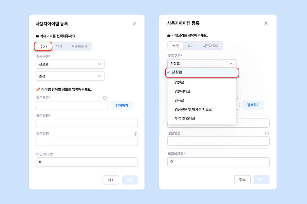 한 번 생성한 사용자아이템은 '항목구분'과 '청구코드' 변경이 불가하니 참고해 주세요.