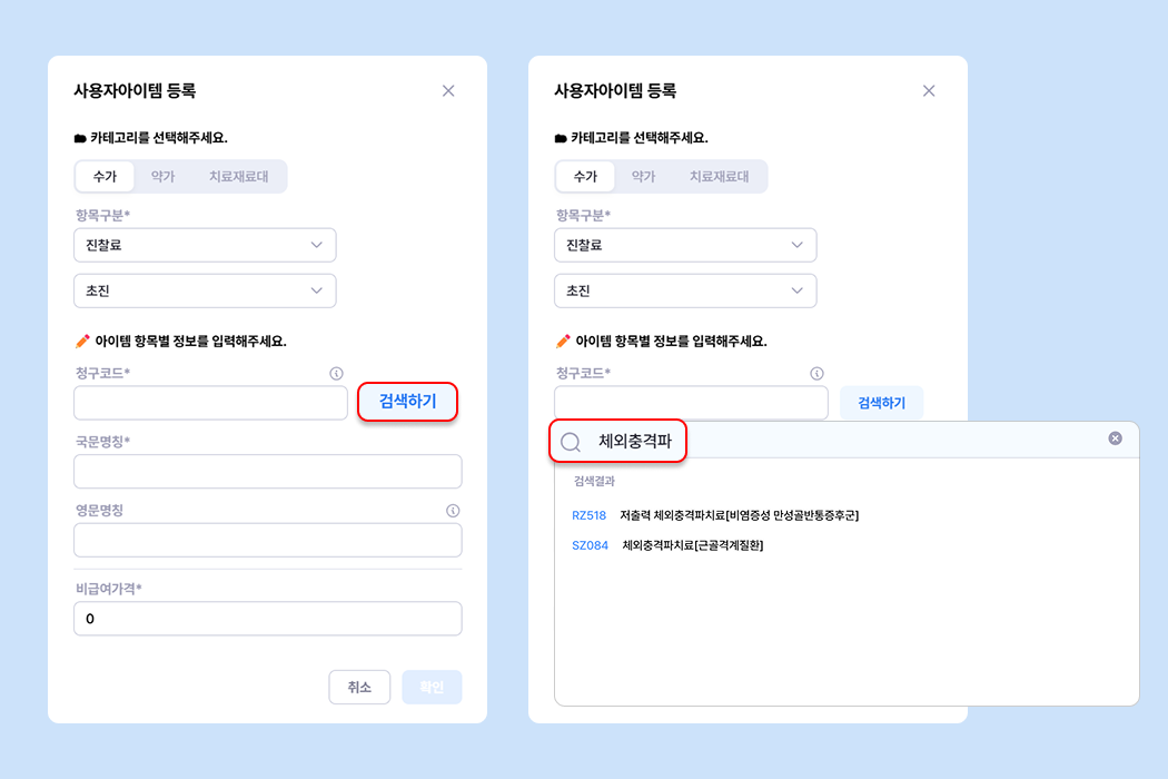 급여아이템과 청구코드가 필요 없는 미용 시술 등은 검색되지 않아요.