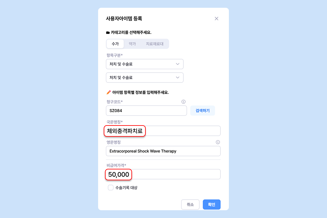 비급여 시술/수술 아이템 등록은 항목구분을 '처치 및 수술료'로 선택해요.