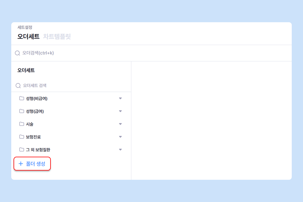 [라이브러리 > 세트설정 > 오더세트] 페이지에서 '+ 폴더 생성' 을 클릭해 폴더를 생성해 주세요.
