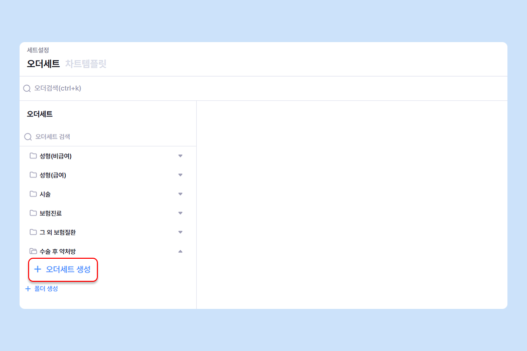 폴더를 열어 '+오더세트 생성'을 클릭해 오더세트를 생성해 주세요.