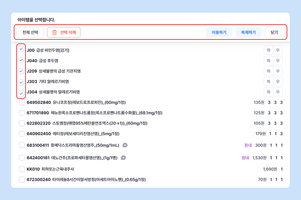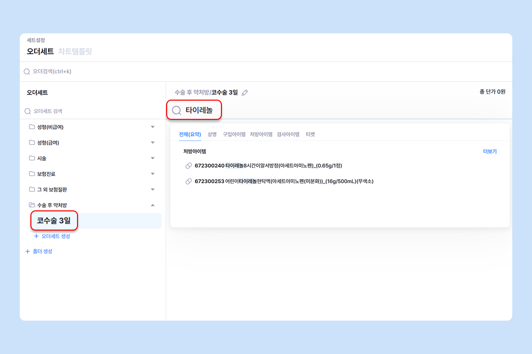 진료 항목 or 아이템 종류 별로 오더세트를 생성하여 진료에 활용해 보세요.