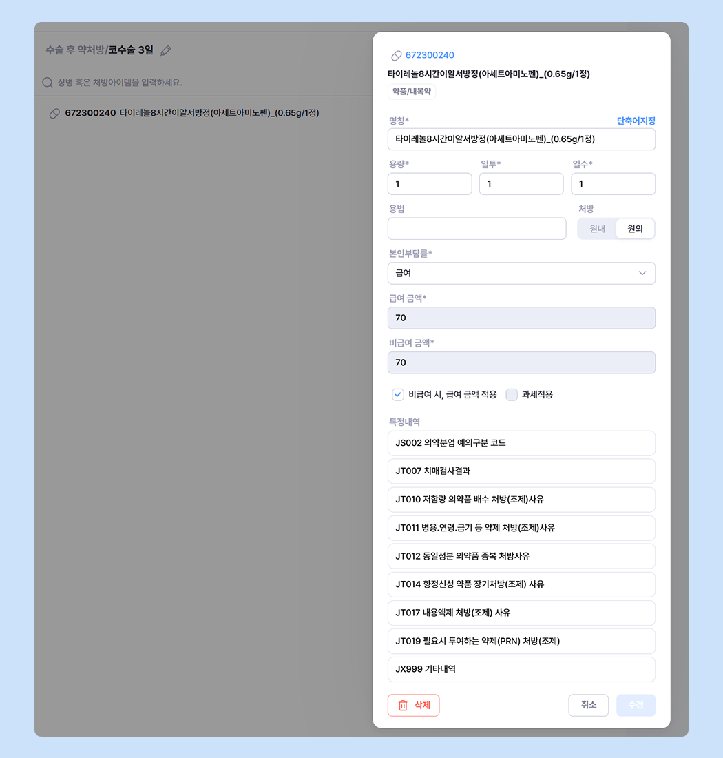 정신과 약을 원내에서 조제 시 JS002-13을 같이 선택해 주세요.