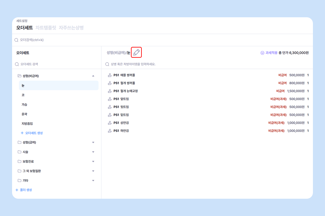 오더세트 명칭은 상단 '✏️' 모양을 눌러 변경할 수 있어요.
