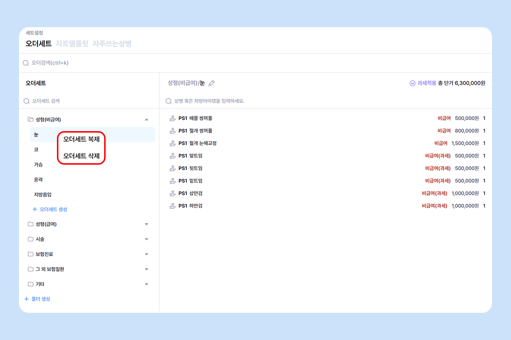 오더세트를 우클릭하여 복제, 또는 삭제를 할 수 있어요.