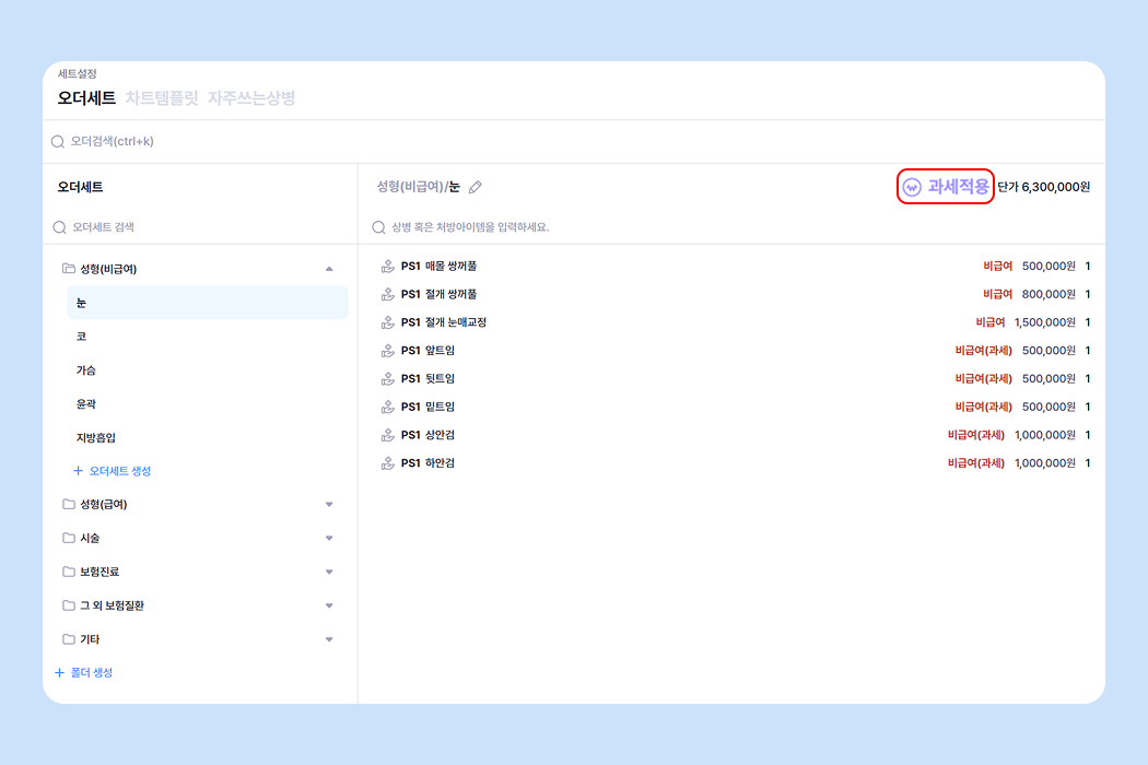 우측 상단 '과세적용' 버튼으로 세트 내 비급여 오더에 전체 과세적용을 할 수 있어요.