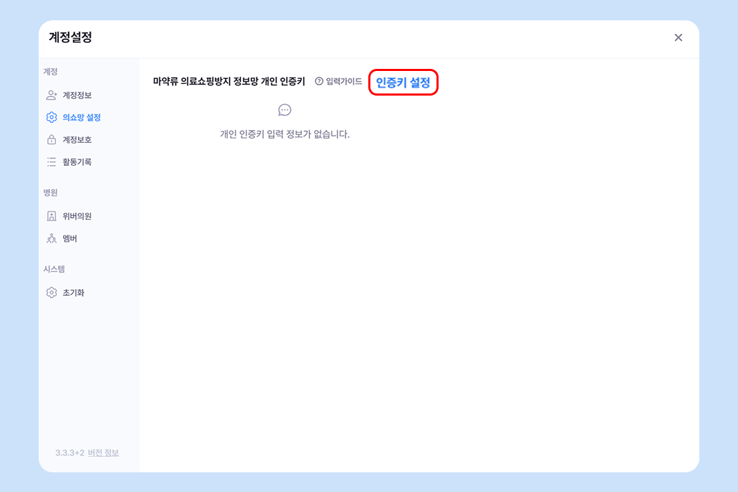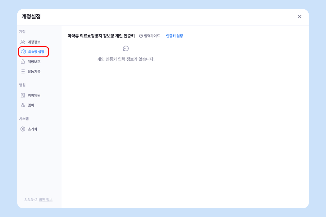 원장님 계정이 로그인 된 상태에서, [좌측 하단 '계정설정' 클릭 > '의쇼망 설정'] 페이지를 확인해주세요.