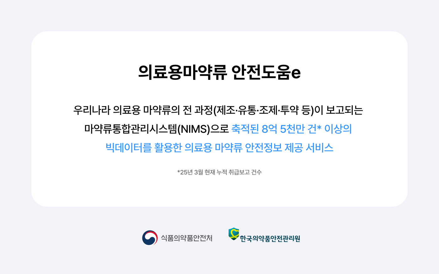 우리나라 의료용 마약류의 전 과정(제조·유통·조제·투약 등)이 보고되는 마약류통합관리시스템(NIMS)으로 축적된 8억 5천만 건 이상의 빅데이터를 활용한 의료용 마약류 안전정보 제공 서비스예요.