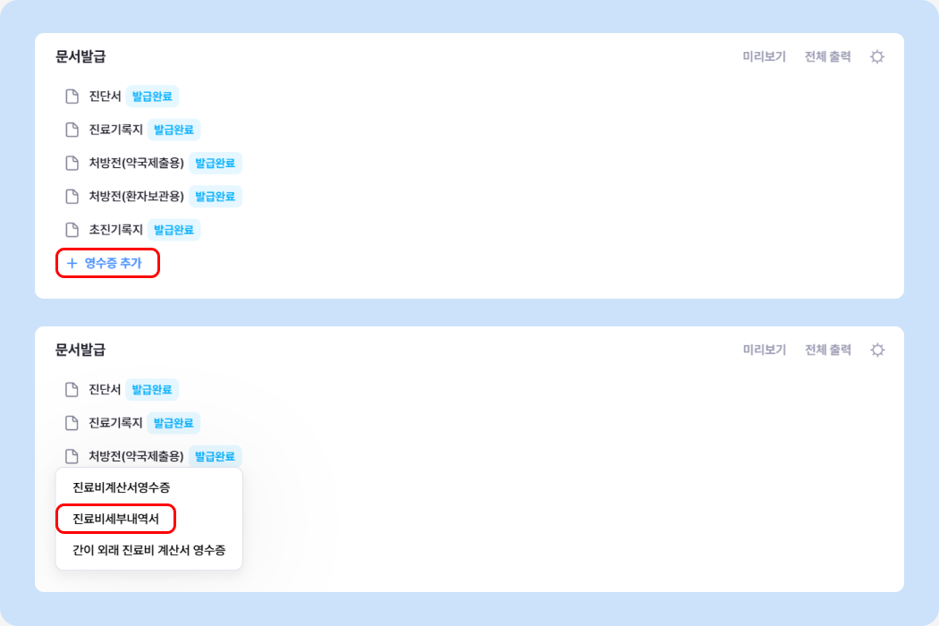'문서발급' 칸에서 '+영수증 추가' 버튼을 눌러 진료비세부내역서를 추가해 주세요.