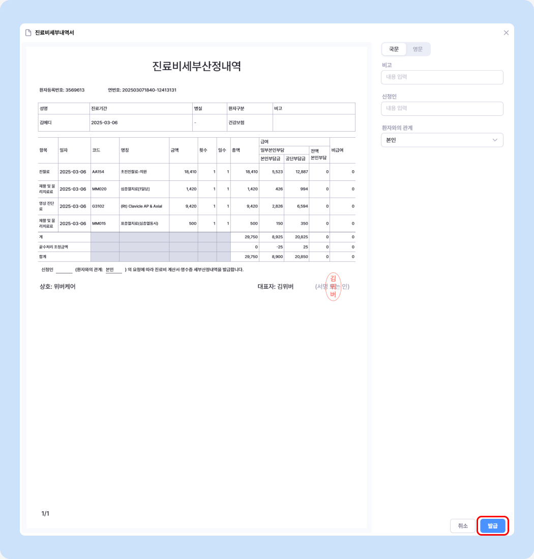 환자의 진료 내역을 진료비세부내역서로 발급하고, 출력해 보세요.