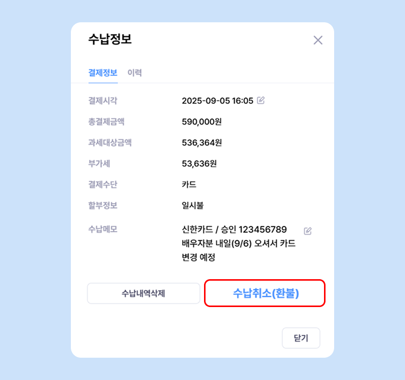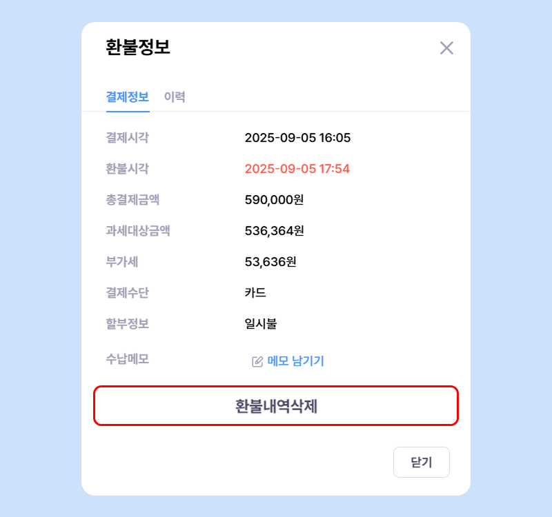 ✅ 환불내역삭제 진행 시, 취소했던 카드/현금영수증 내역이 다시 승인되지는 않습니다.