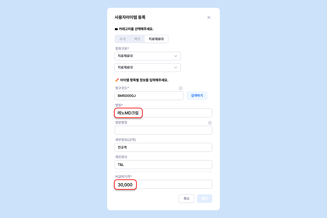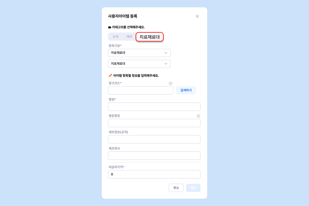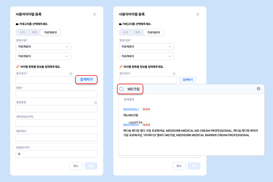 비급여 치료재료대아이템의 경우 팔레트에 먼저 등록해야 처방할 수 있어요.