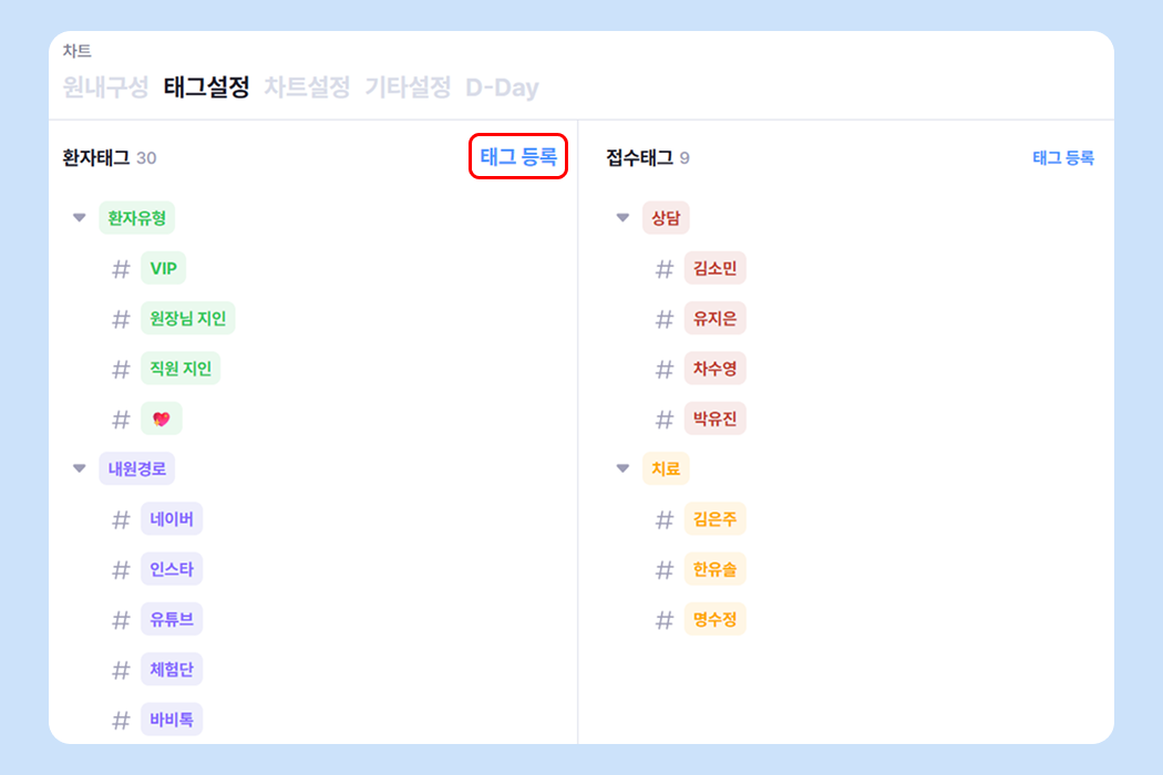 [관리 > 차트 > 태그설정] 페이지에서 환자태그 등록을 진행해 주세요.