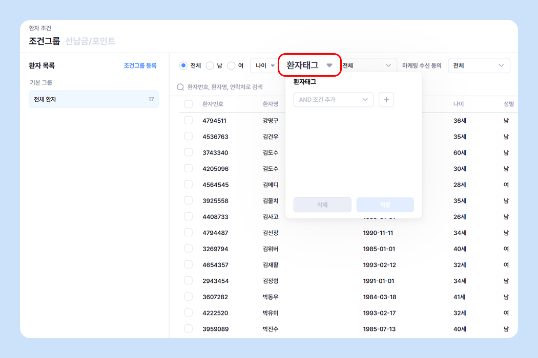 [환자 > 환자 조건 > 조건그룹] 페이지에서 환자 차트에 태그한 환자태그를 필터링하여 확인할 수 있어요.