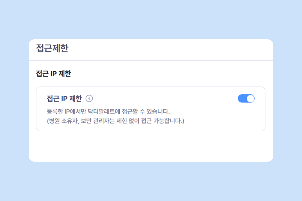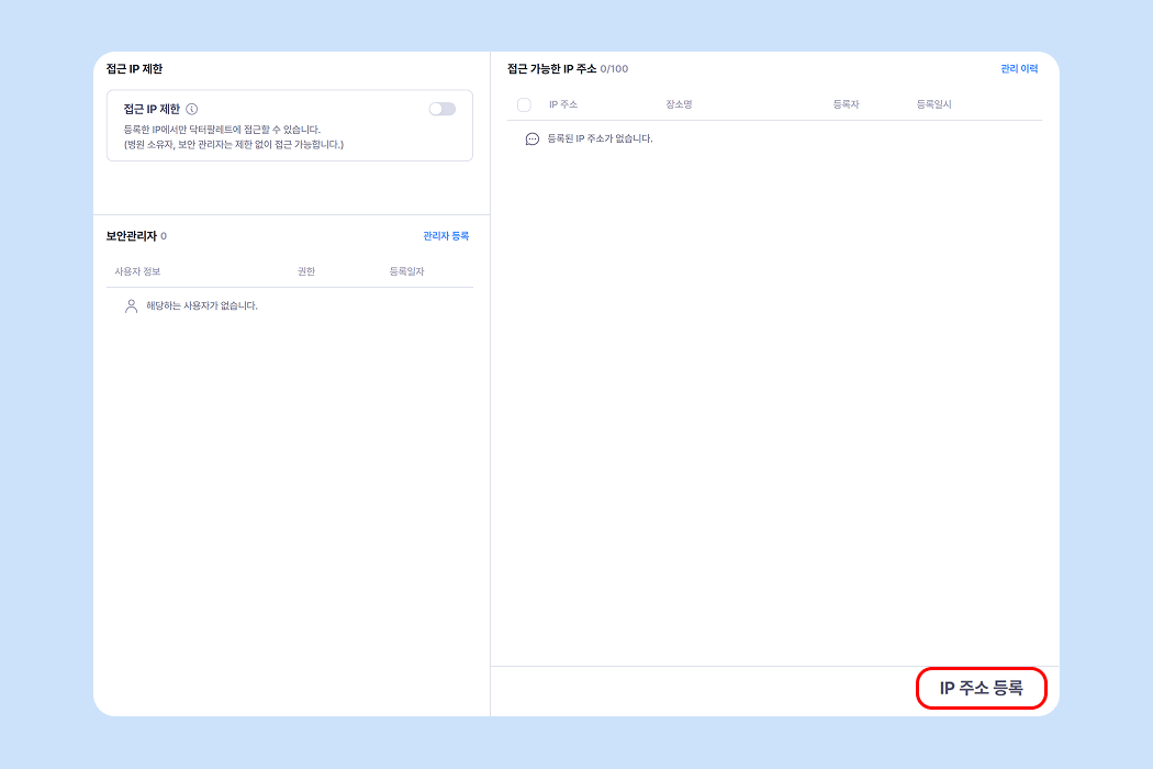 병원 네트워크 외에서 접속을 제한하고 싶다면, IP를 등록하고 기능을 활성화 하세요.