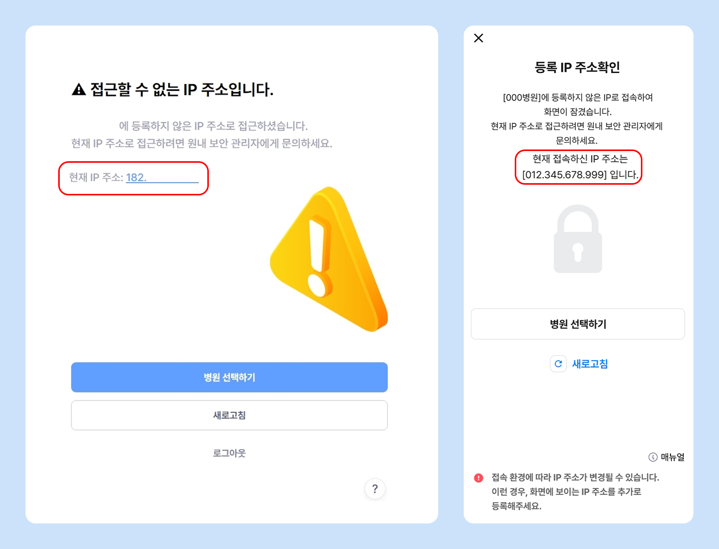 대표원장님 또는 원내 보안관리자에게 IP 주소 추가를 요청해 주세요.