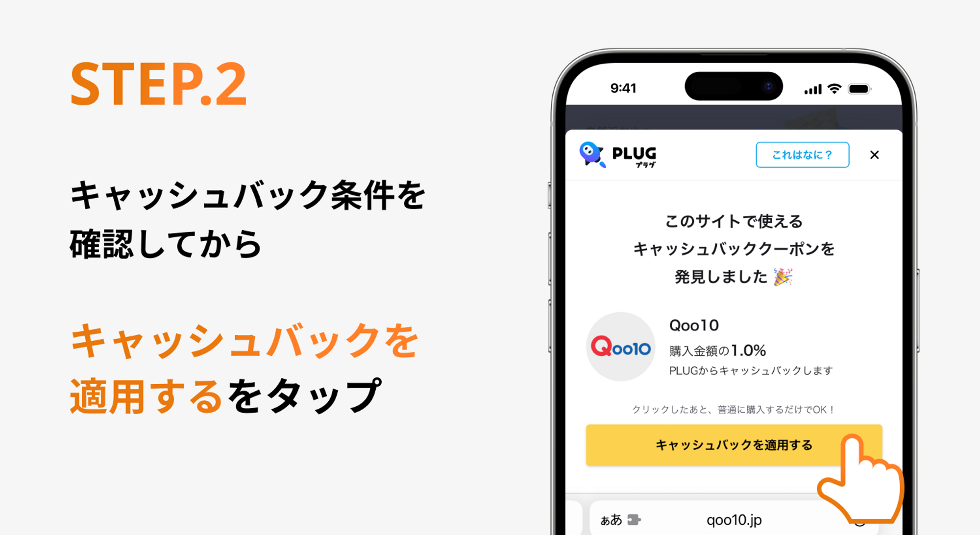 キャッシュバック有効化後に他のサイトやアプリを閲覧した場合、PLUGのキャッシュバックが正常に動作しない場合があります。有効化後は、必ず購入が終わるまでサイトから離脱しないようお願いいたします。