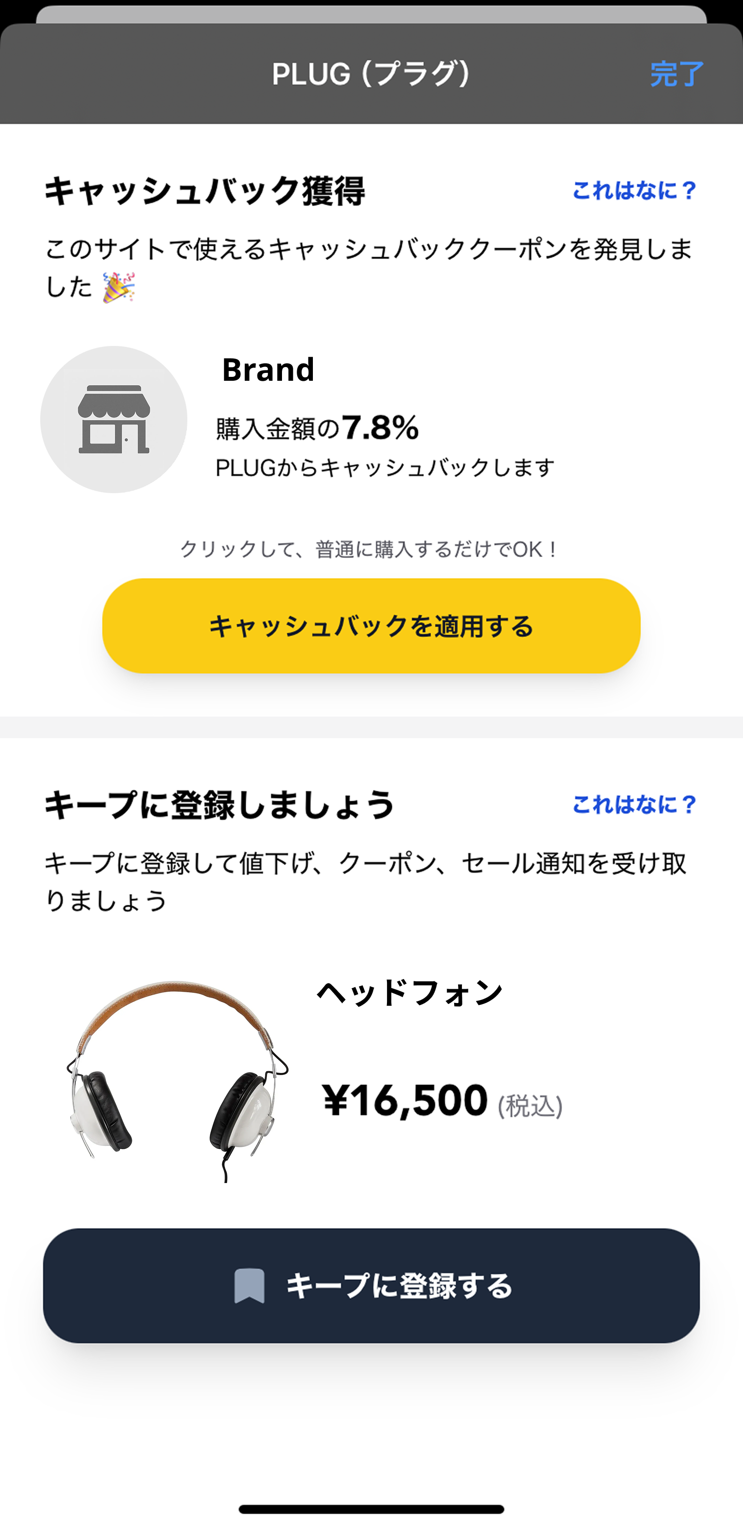対象サイトで商品を閲覧している際に、PLUGアイコンをタップすることでポップアップが開かれます。