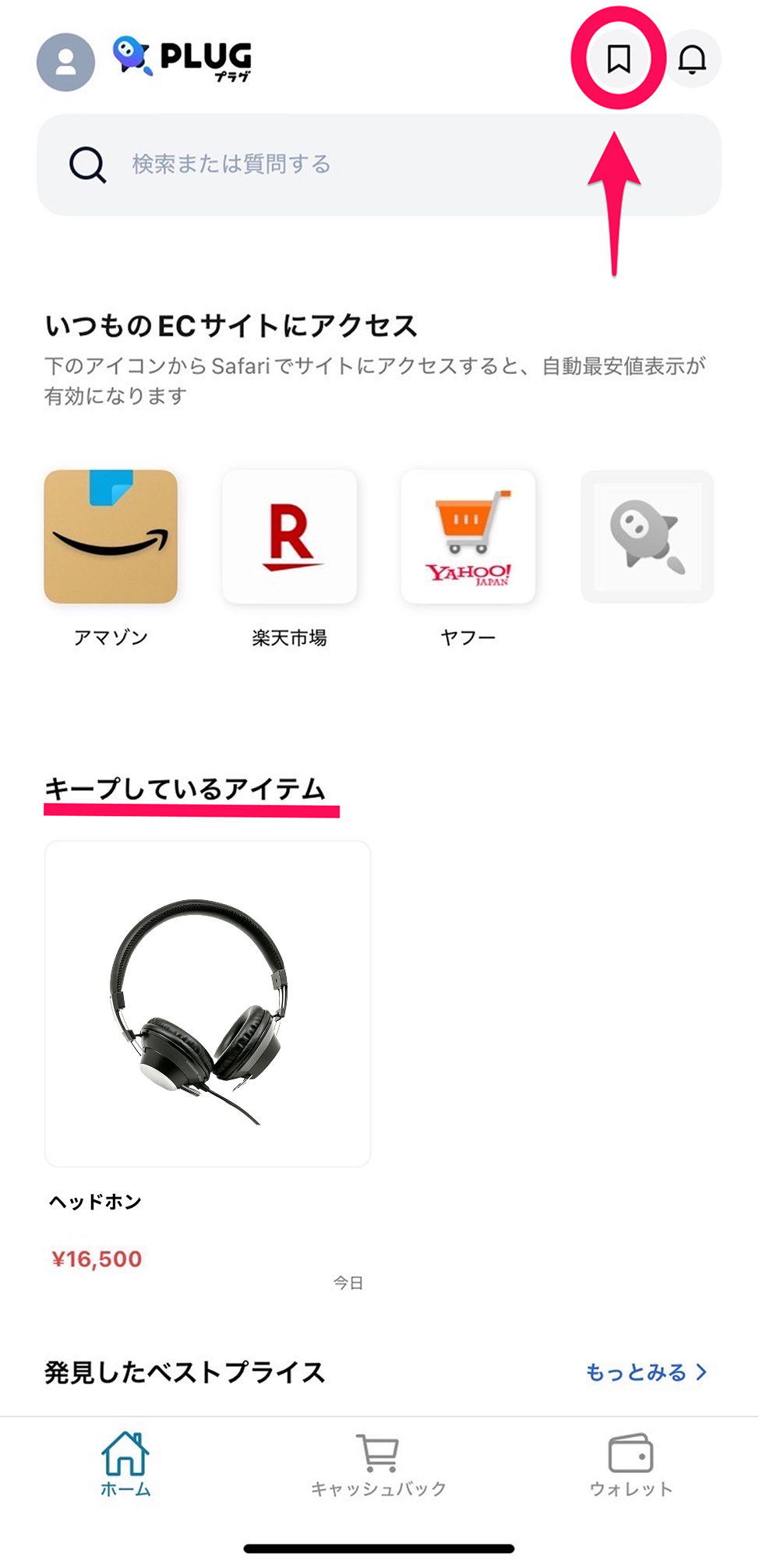 「アプリ内ホーム画面から[商品を検索]→欲しい商品をタップし商品ページを開く→PLUG最安価格の隣に表示される[キープする]をタップする」ことで、商品を保存することができます。
