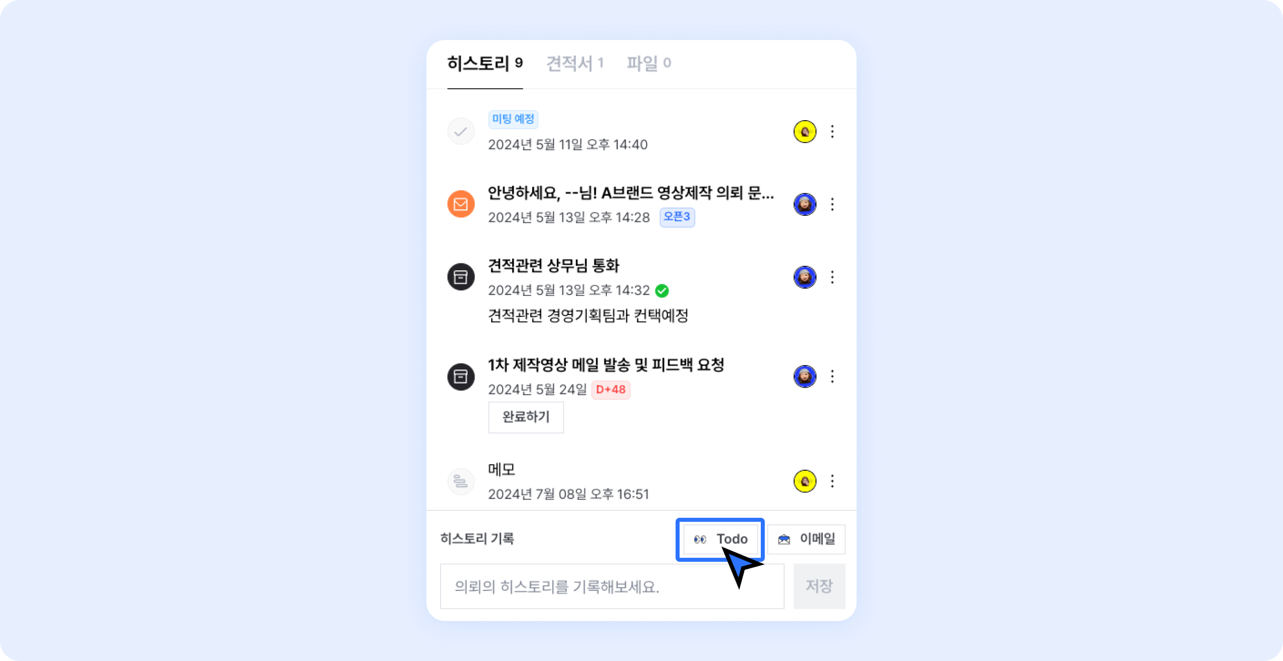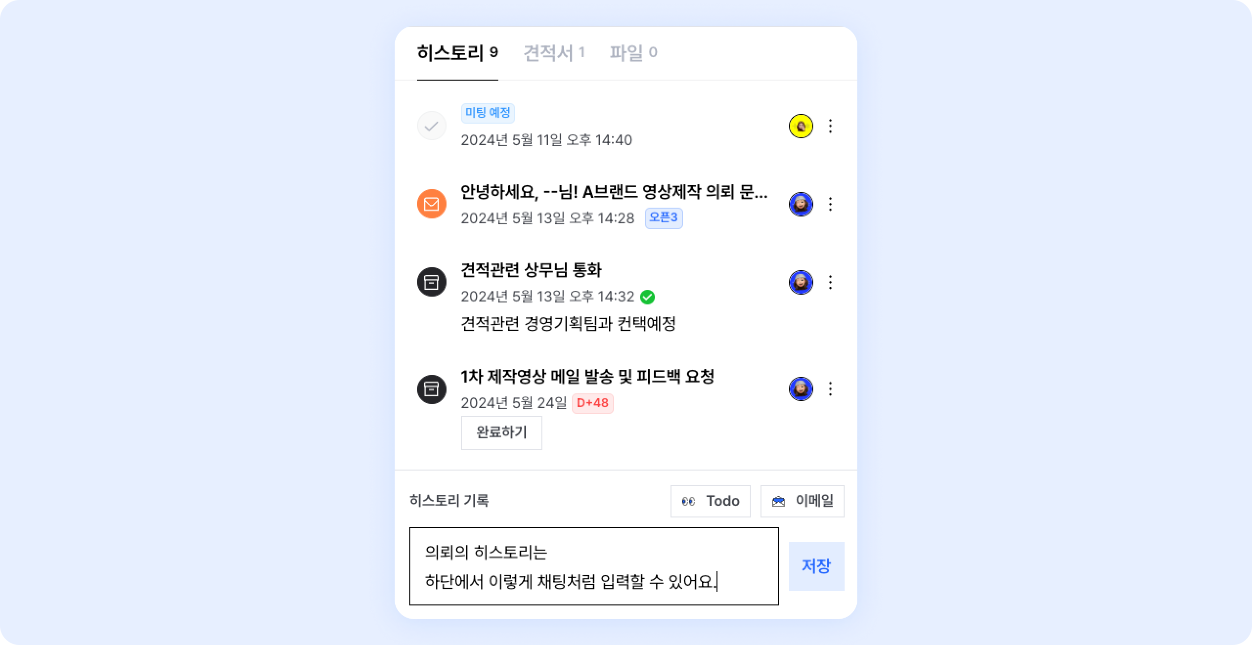 히스토리 기록: 해당 의뢰에서 발생한 히스토리를 채팅형태로 입력하고 기록할 수 있어요.