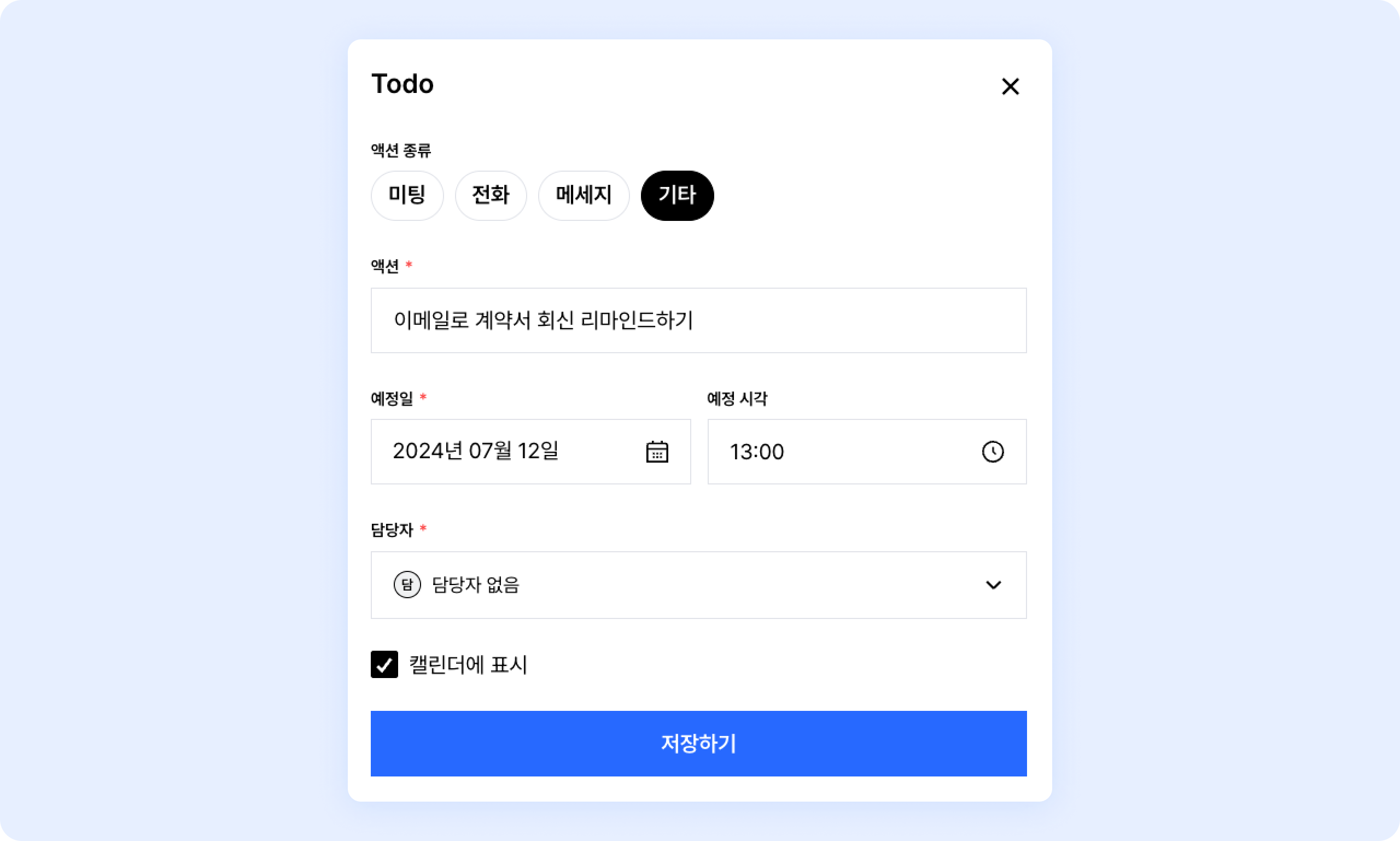 액션 종류와 액션, 예정일, 시각, 담당자를 등록할 수 있어요.캘린더에 표시를 체크하면,일정캘린더에서 해당 투두 일정을 확인할 수 있어요.