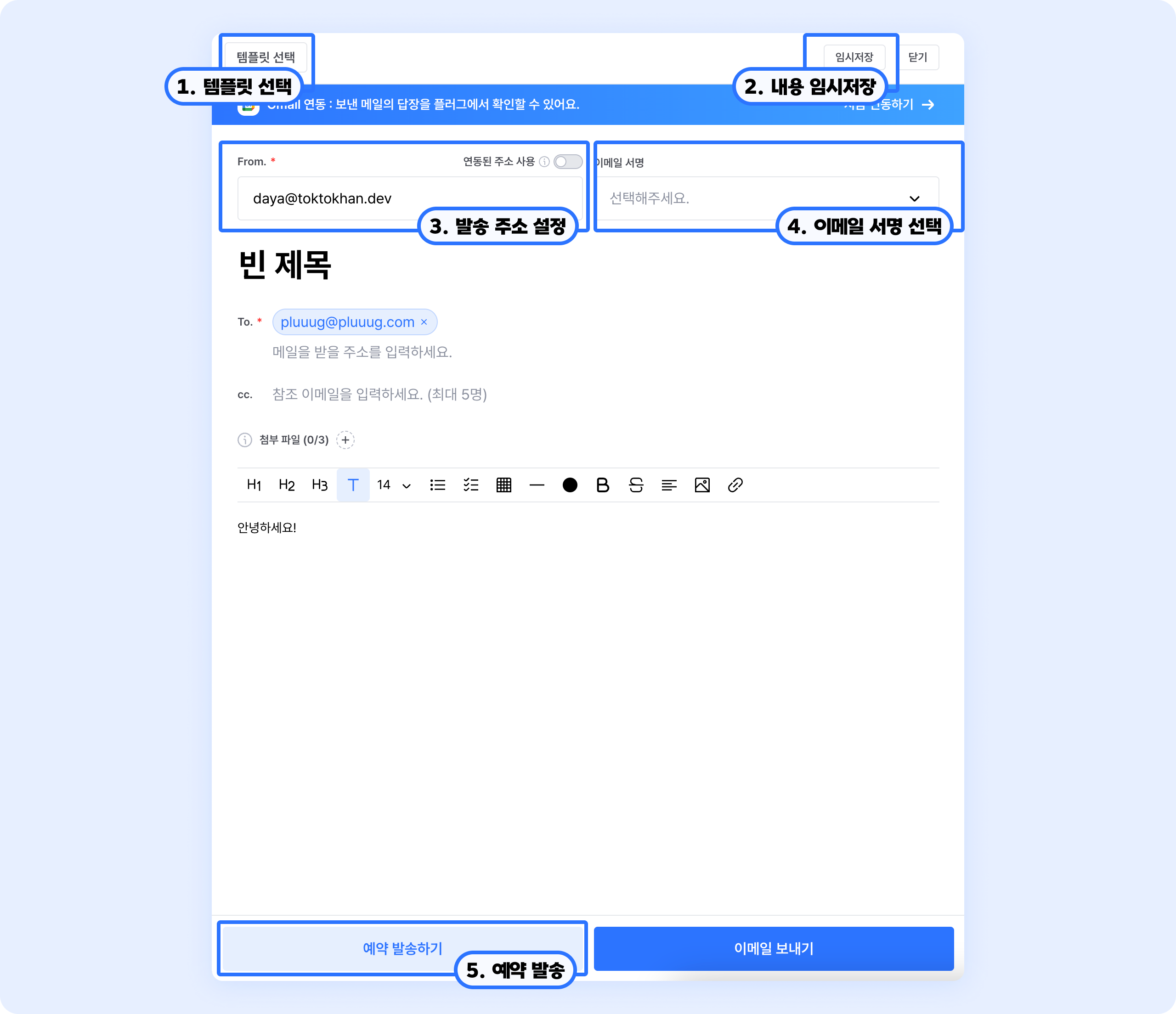 이메일을 바로 보내지 않고, 일자와 시각을 설정해 예약 발송을 할 수 있어요.