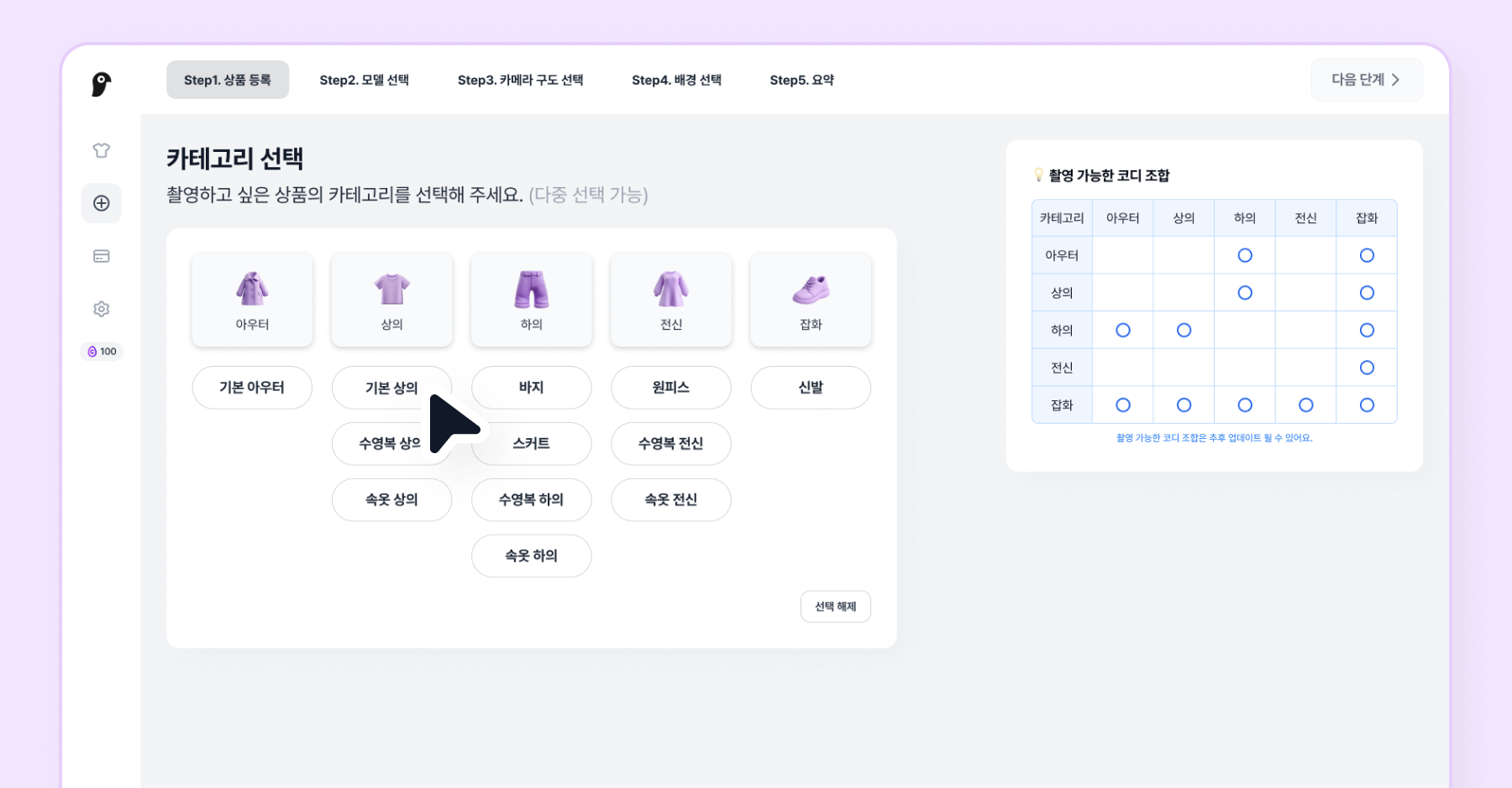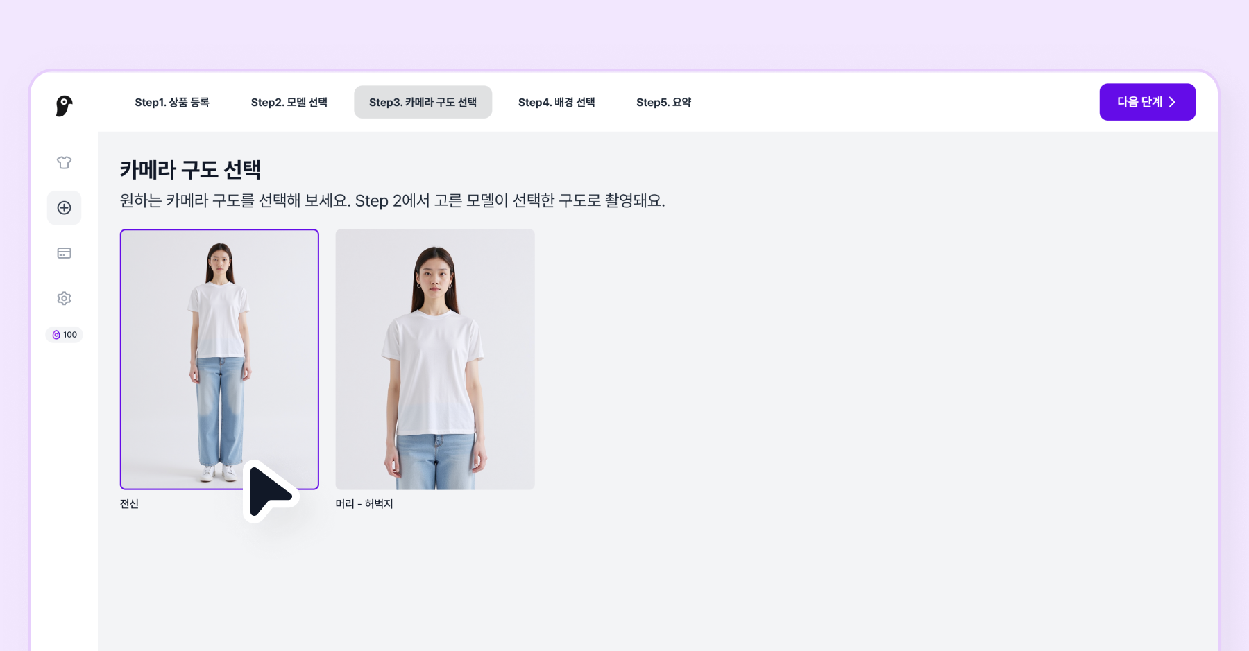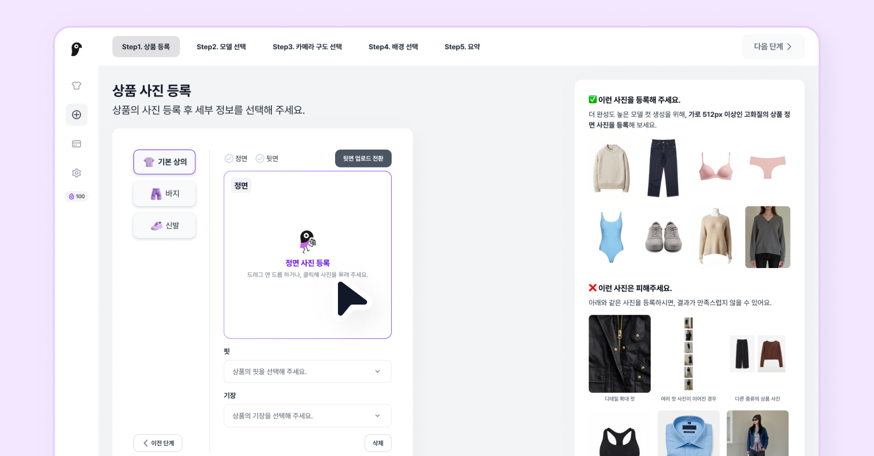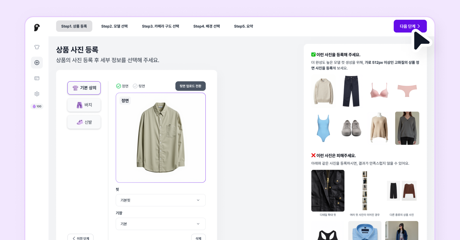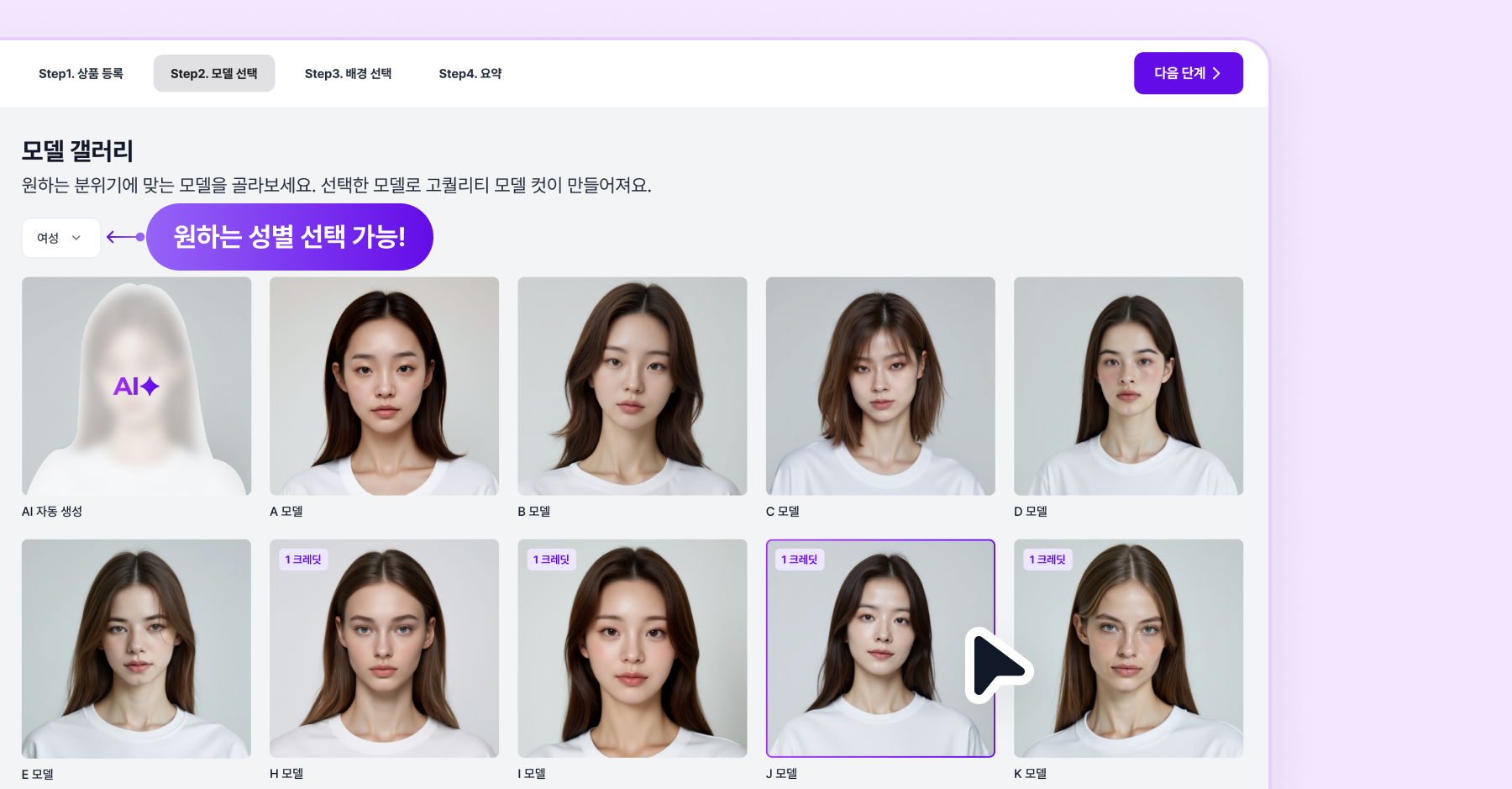 상품 사진을 모두 등록했으면 다음 단계를 클릭하여 모델을 선택해주세요.