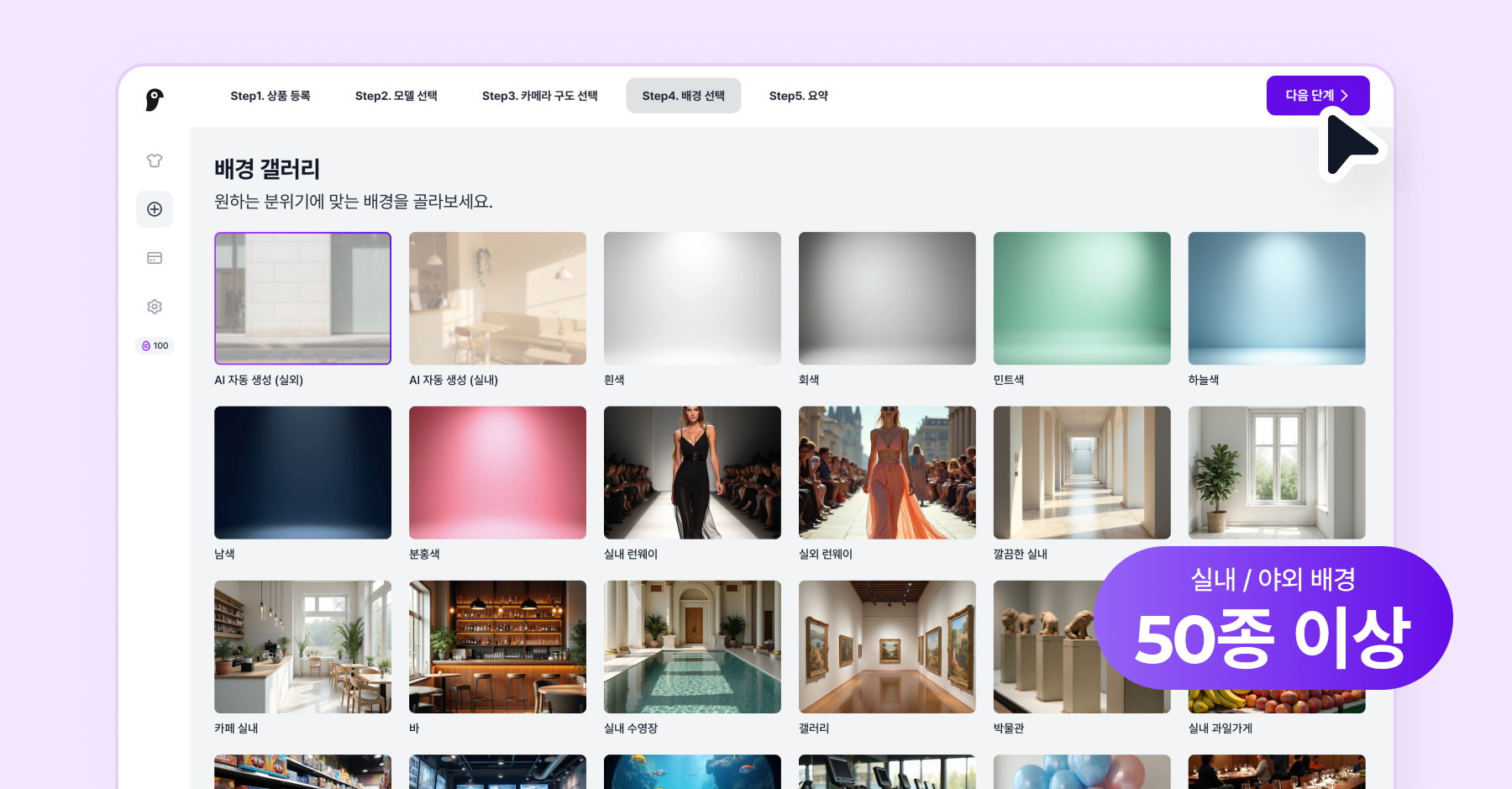 등록하신 상품과 어울리는 배경을 골라보세요. 선택한 배경으로 모델 컷이 생성돼요.