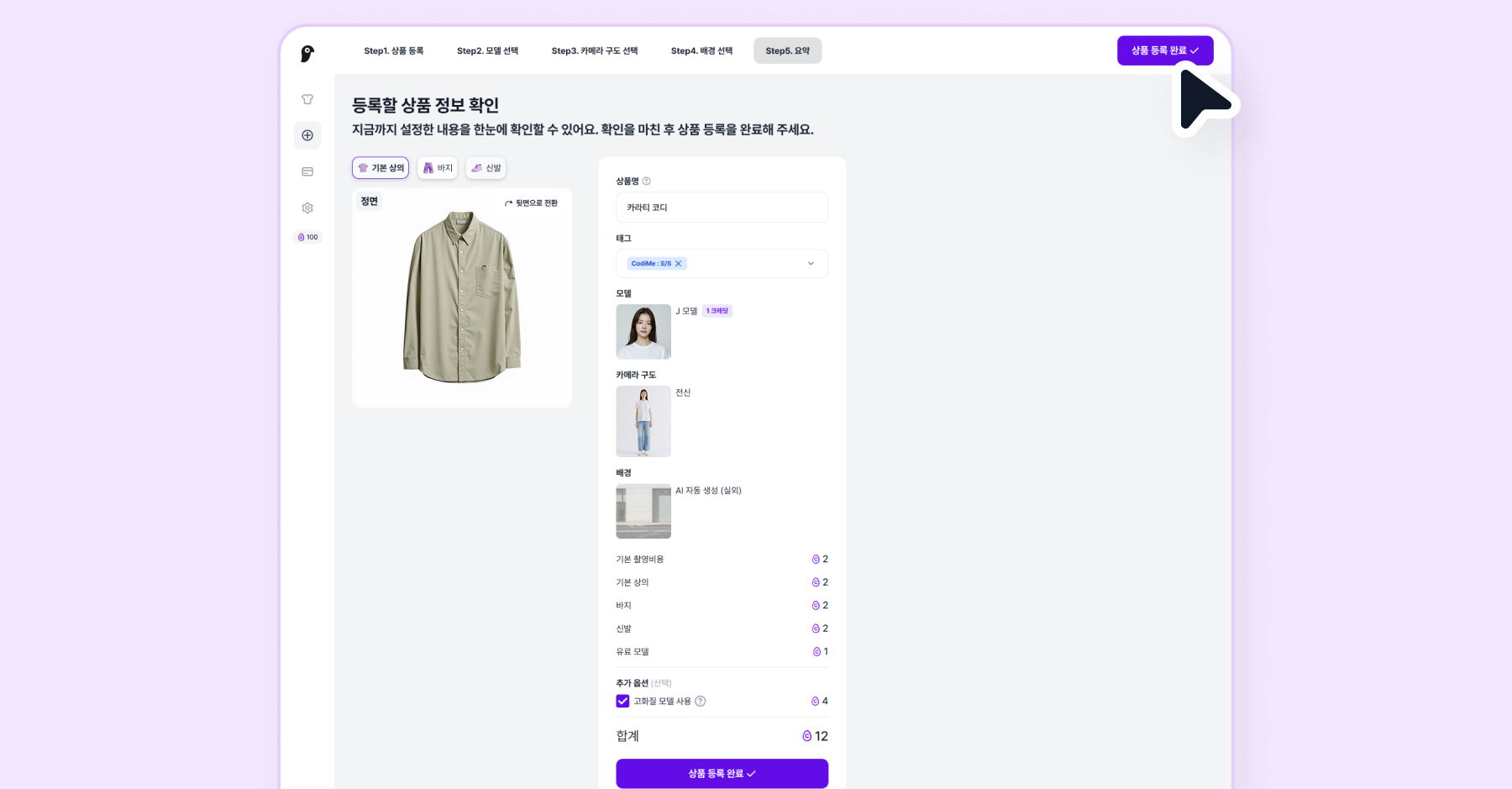 모든 정보를 입력하고 상품 등록 완료를 클릭하면 모델 컷 촬영 준비가 완료돼요.