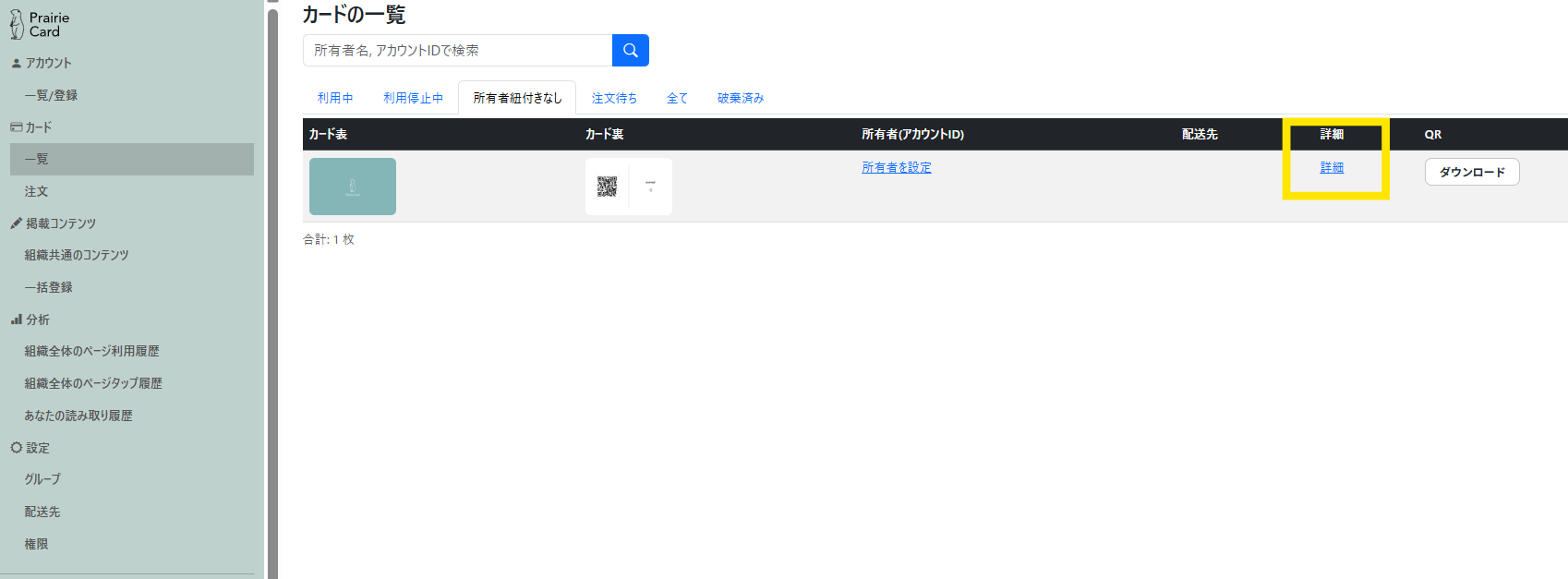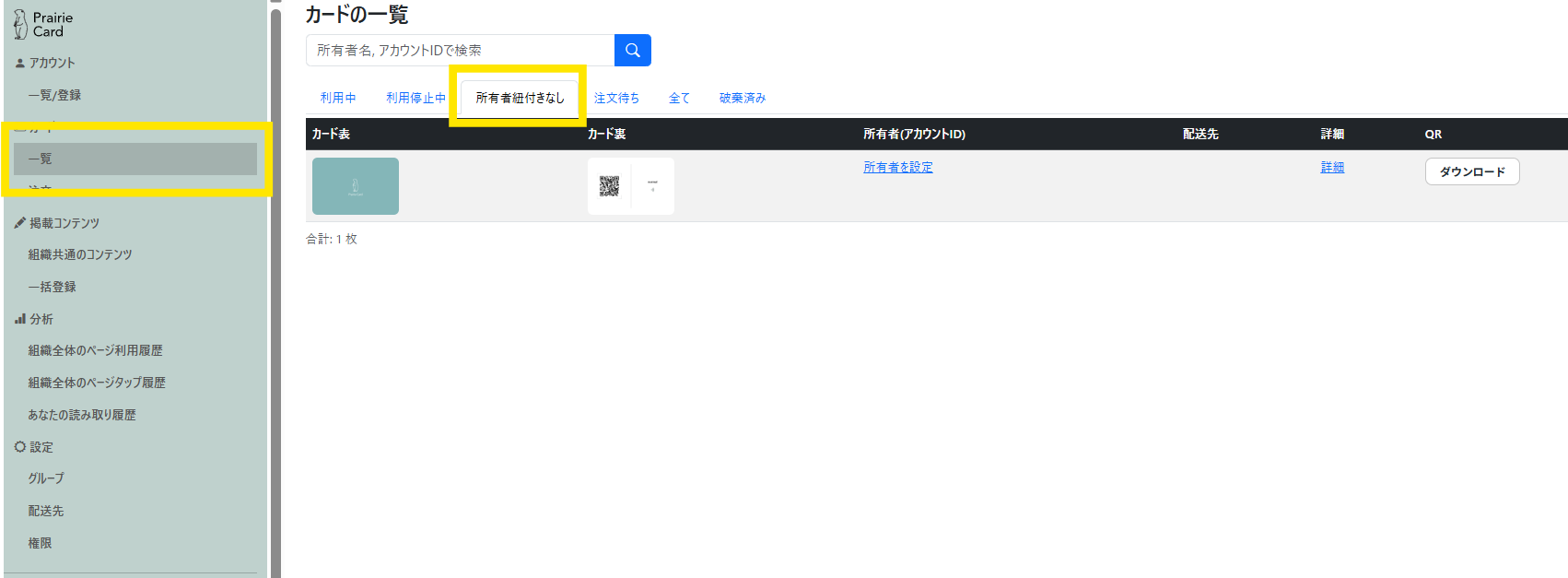2.カード一覧の画面で、「所有者紐付きなし」のタブをクリックします。