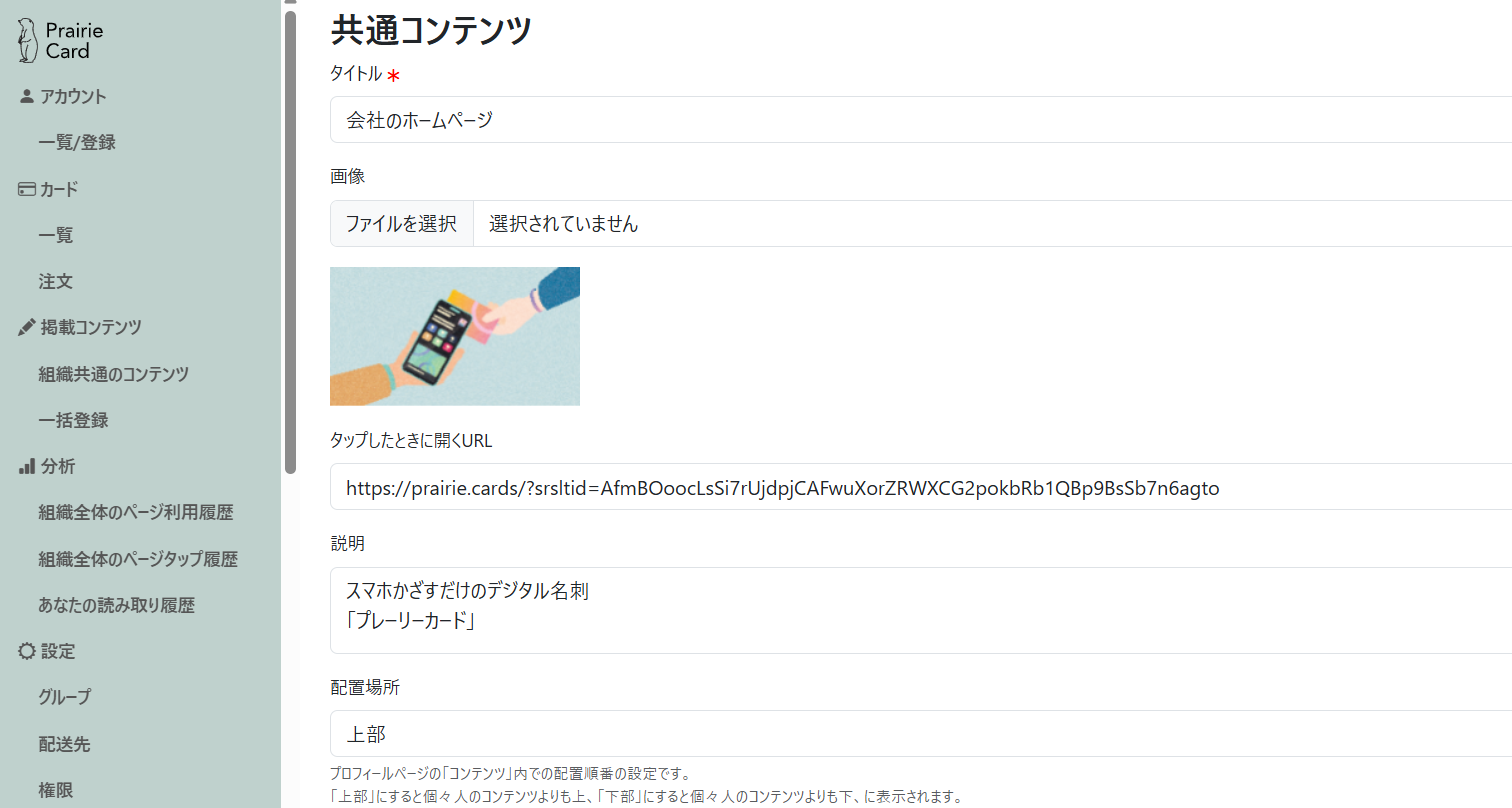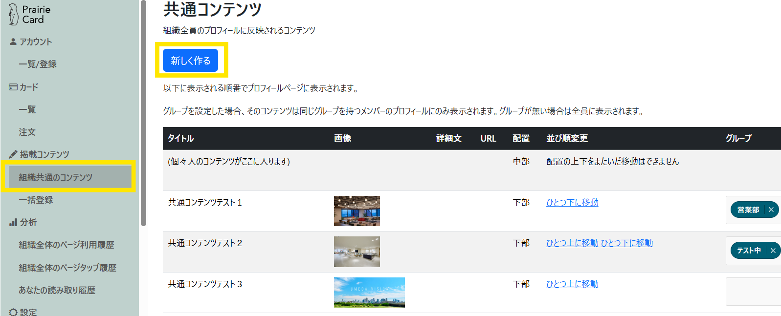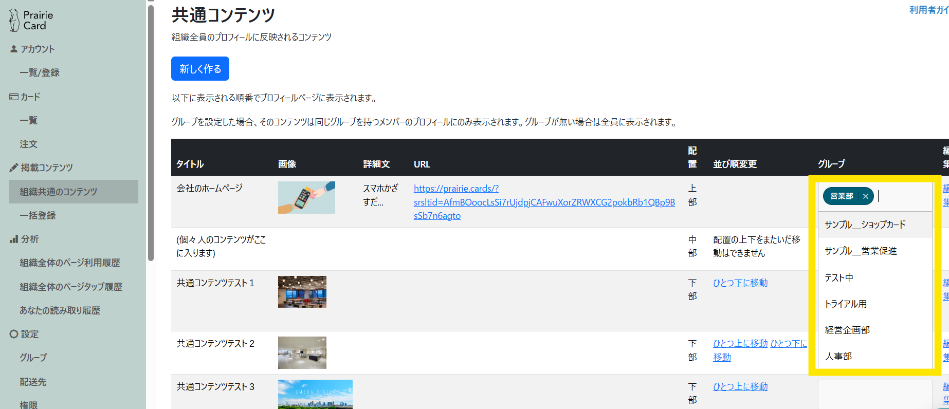 「グループ」> 作成したコンテンツを表示させたいグループを選択してください。