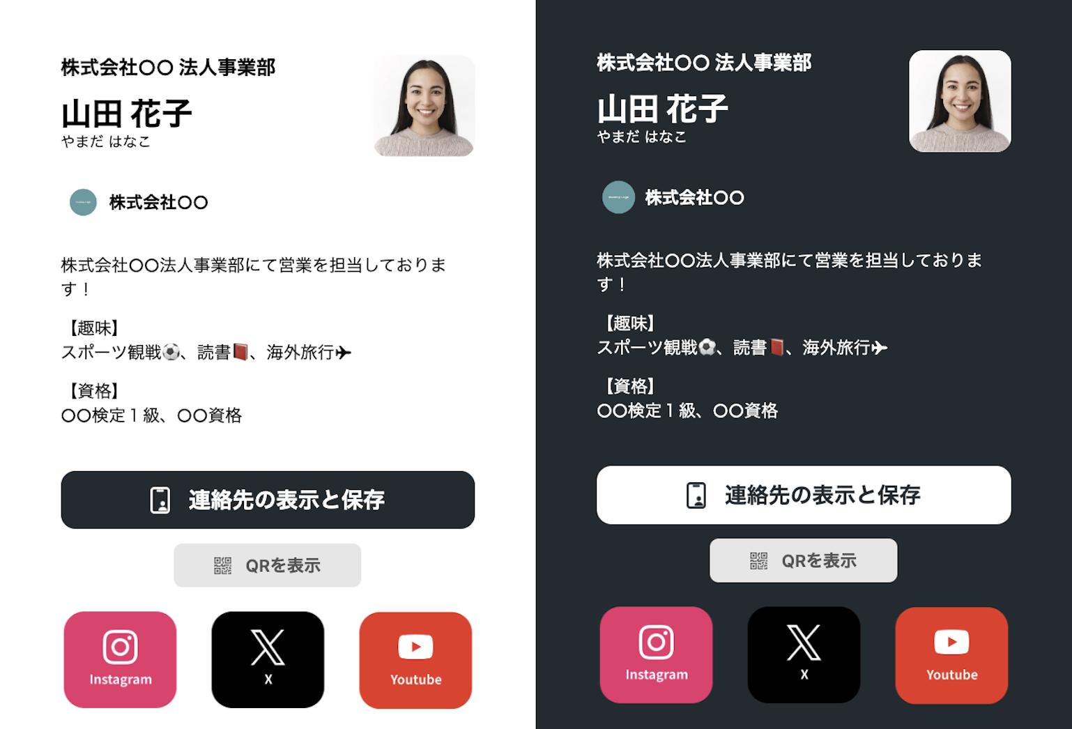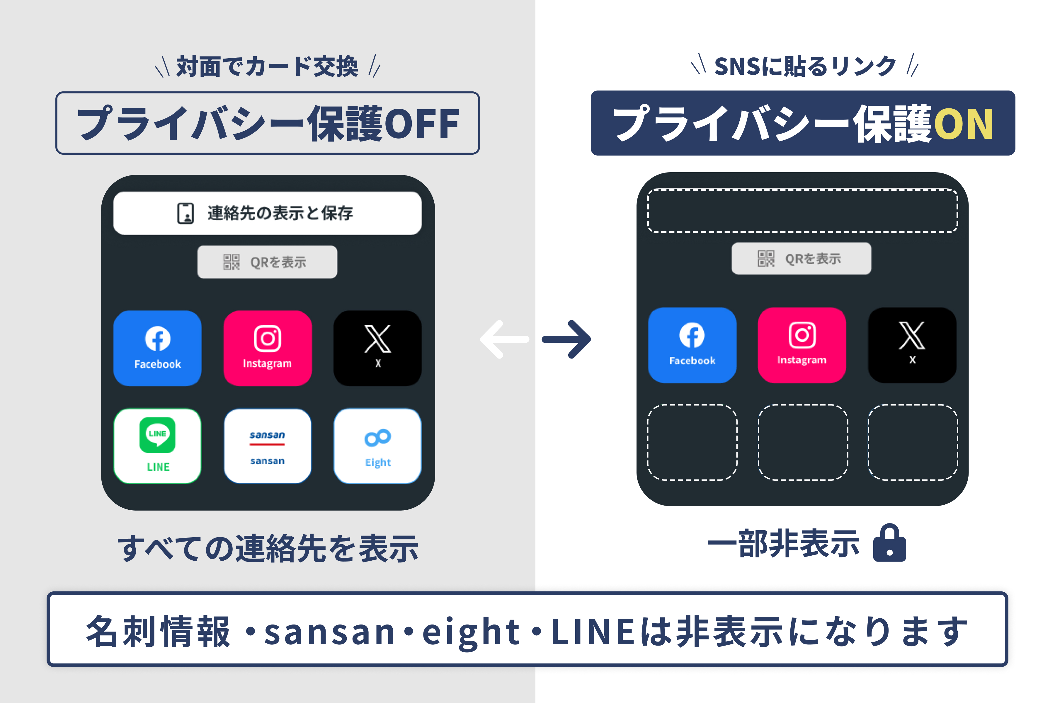 対面でカード交換した際と、オンライン(SNSのプロフィール等)で公開した際で一部のアプリケーションを表示・非表示にできる機能です。メールアドレス・LINEなどの個人情報を対面時のみ表示できます。