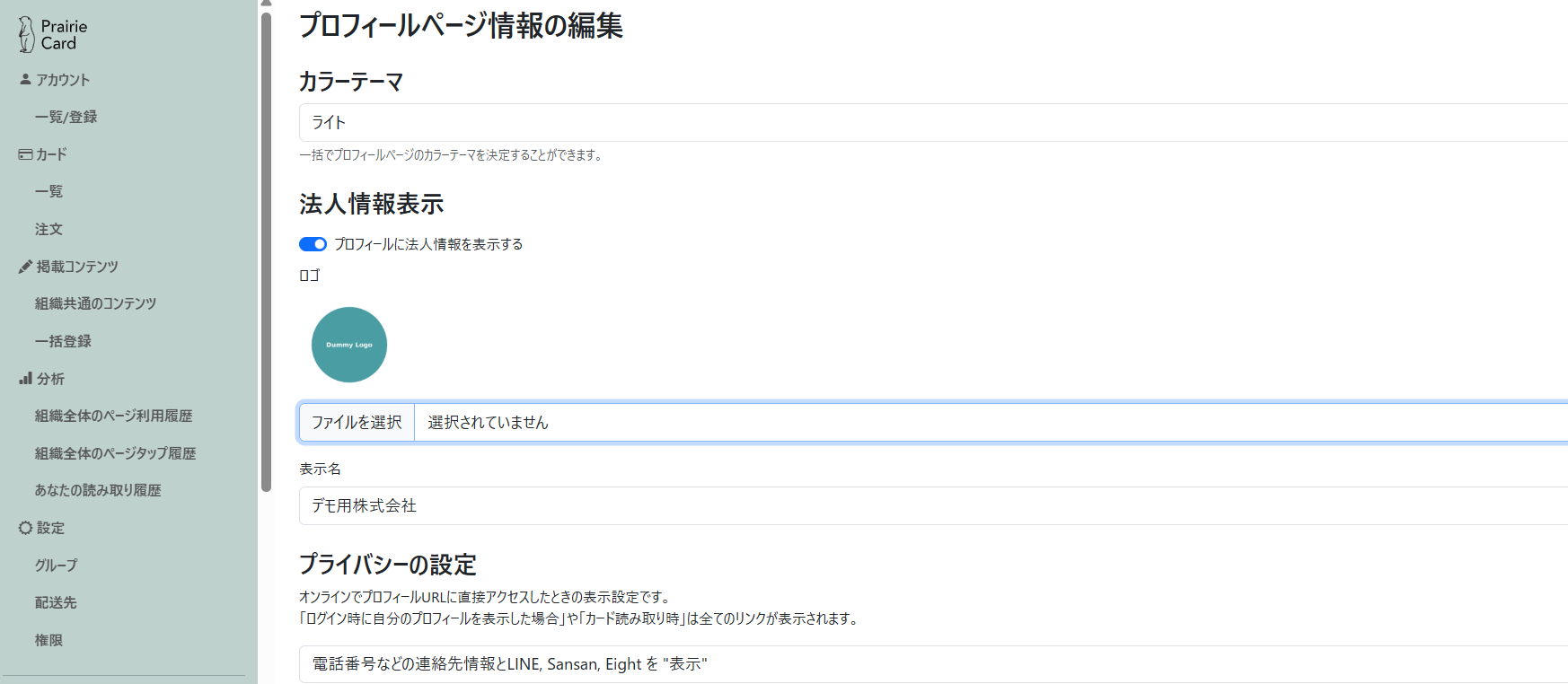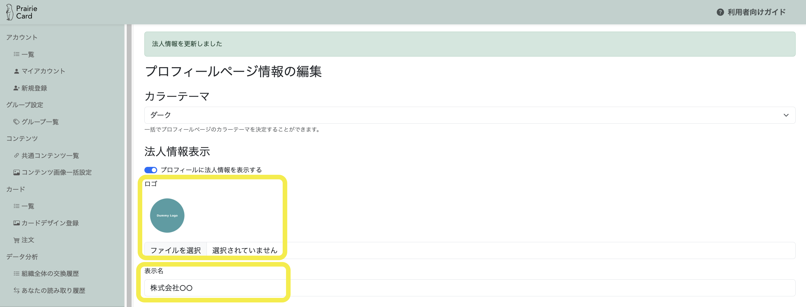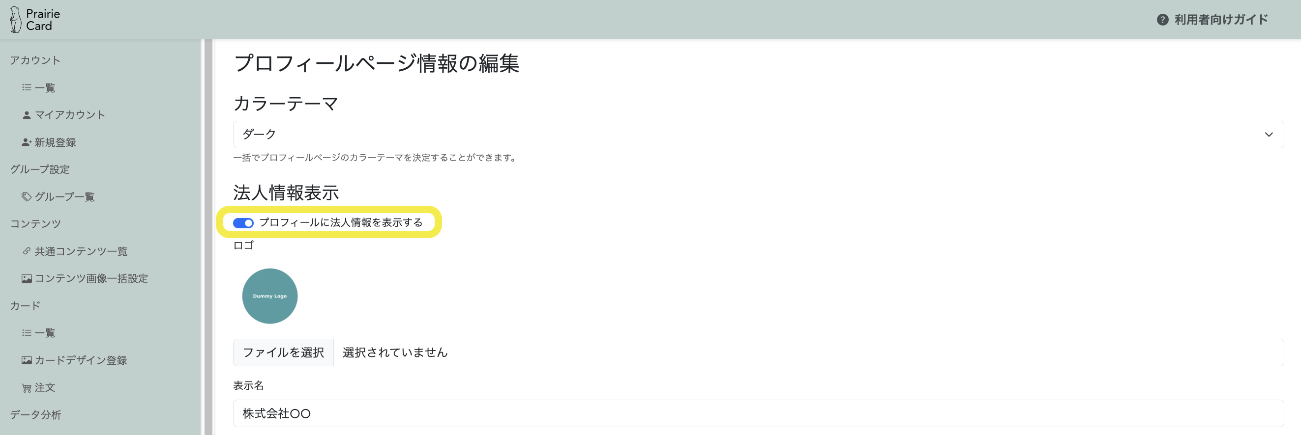プロフィールページに法人情報(ロゴ、表示名)を表示するかどうかをご選択いただけます。