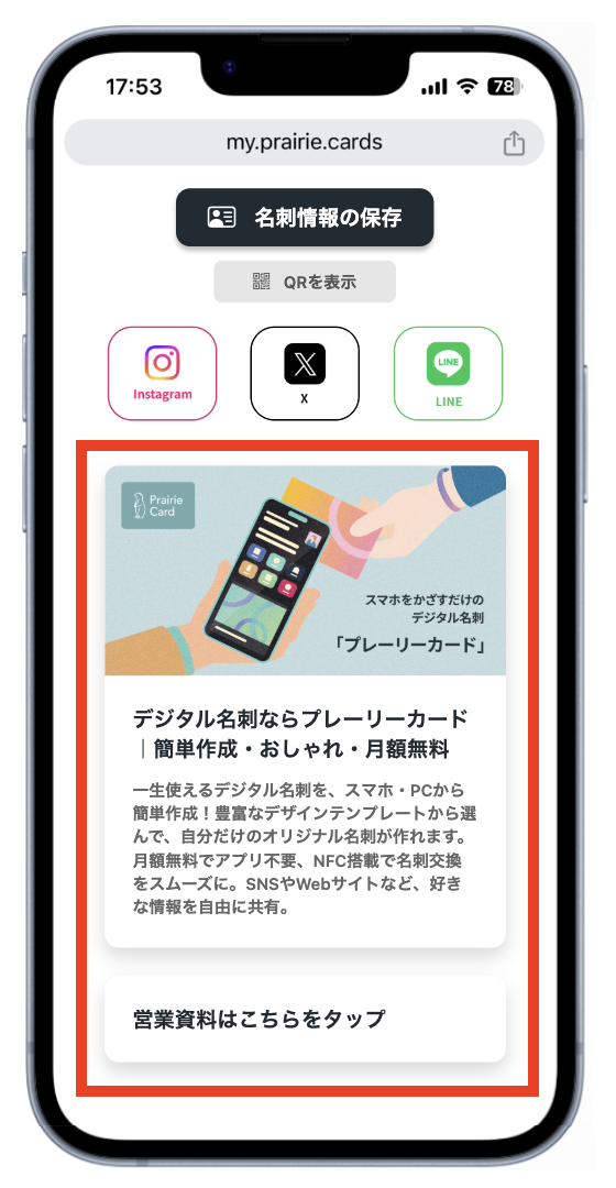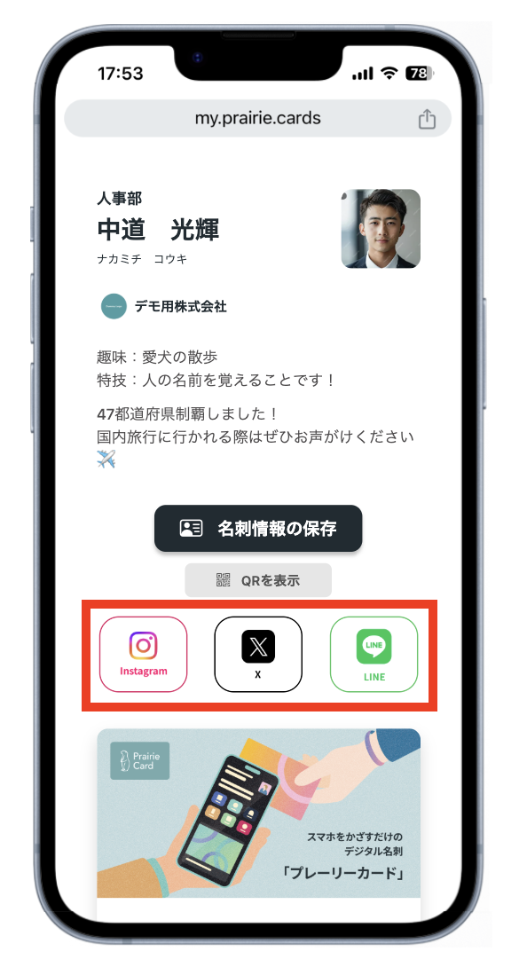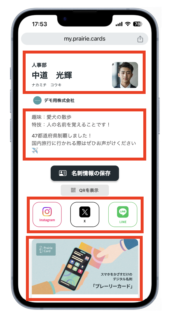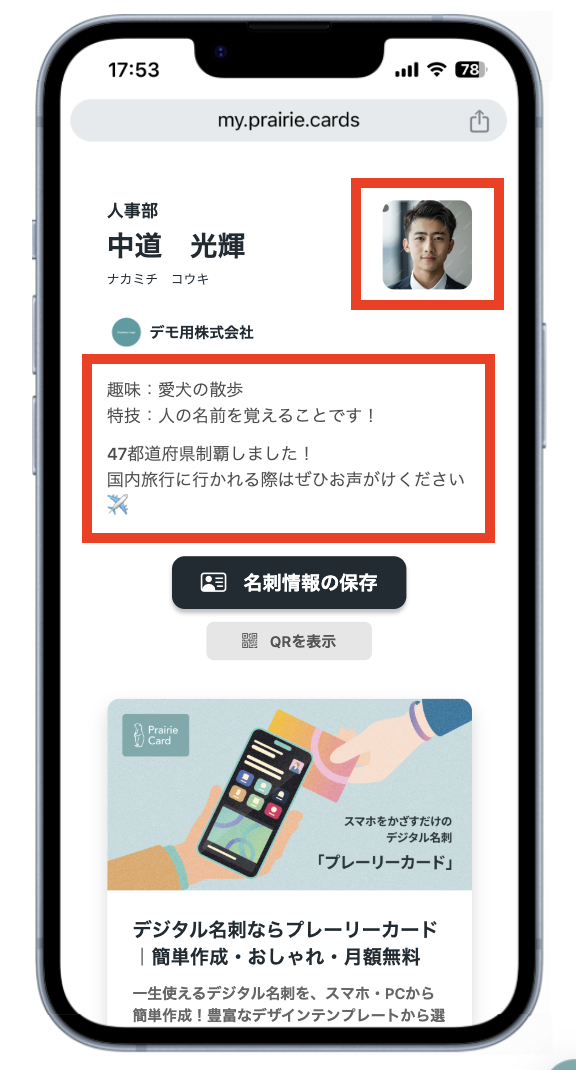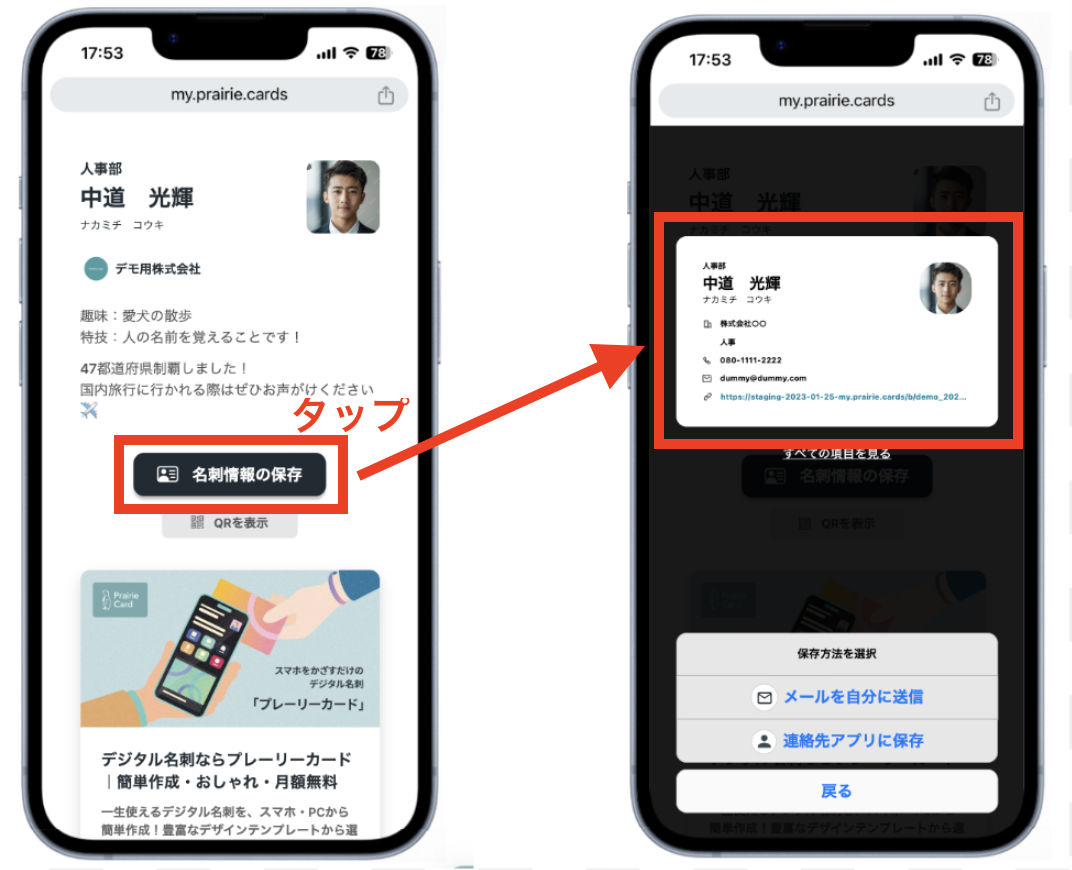 「名刺情報の保存」ボタンをタップした後に表示される連絡先情報です。