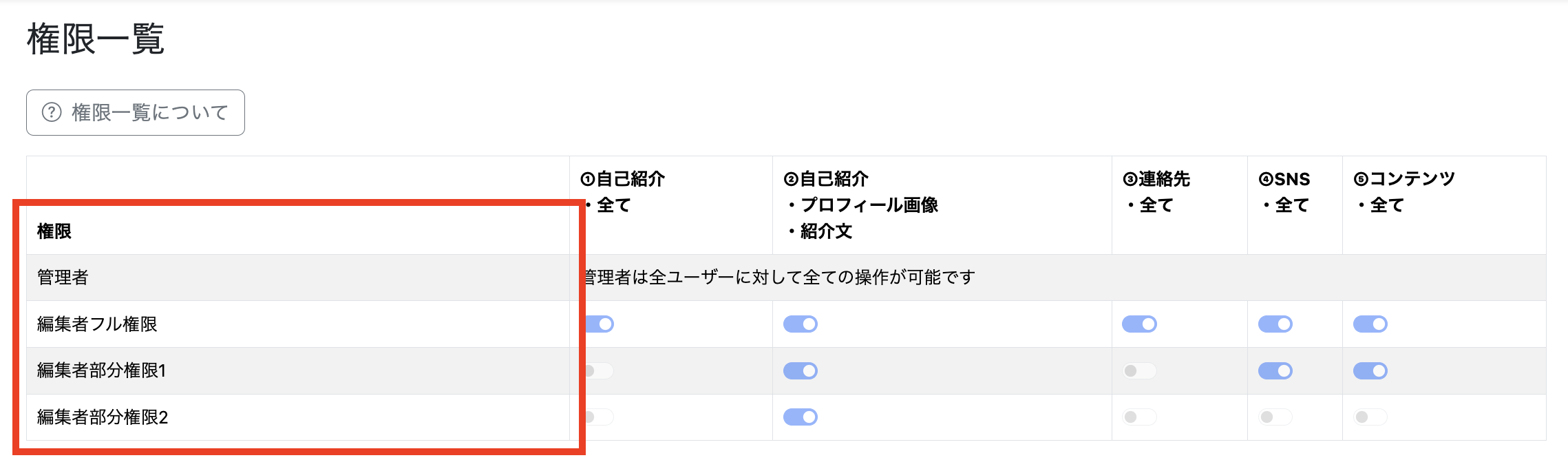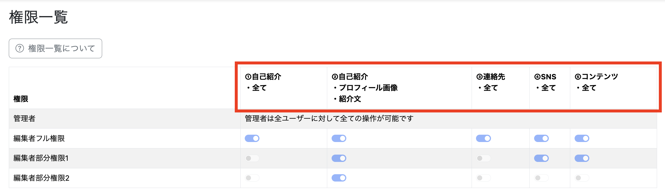 これまで、編集者の権限について、「プロフィールページ」「連絡先」「SNS」「コンテンツ」の全てについて、編集できる権限のみしか付与できませんでしたが、連絡先・肩書情報については管理者が管理し、それ以外の情報のみ編集権限を付与したいというご要望が多くありました。