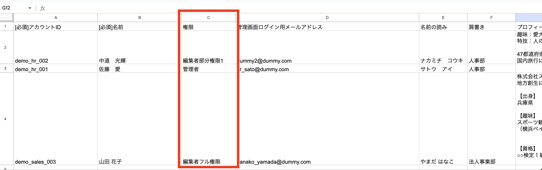 複数アカウントを一括で新規作成、または一括編集する際には、CSVまたはExcelの「C列:権限」に正確な権限名を入力してください。入力可能な権限名は権限一覧ページにてご参照ください。