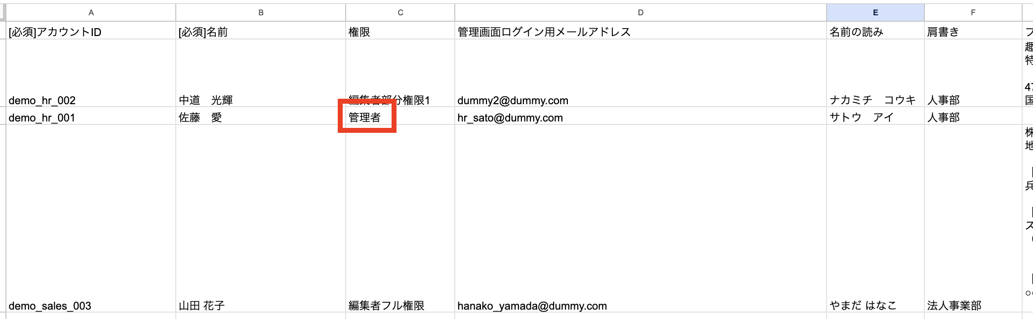 <C列:権限>に「管理者」と入力し、<D列:管理画面ログイン用メールアドレス>にはカード所有者のメールアドレスを入力してください。