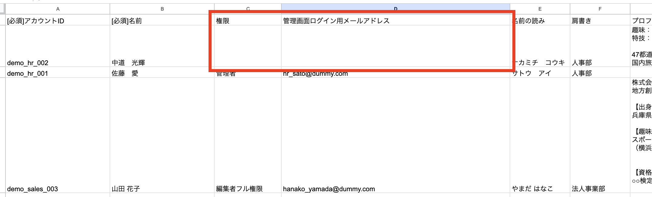 <C列:権限>および<D列:管理画面ログイン用メールアドレス>は空白のままインポートを行なってください。