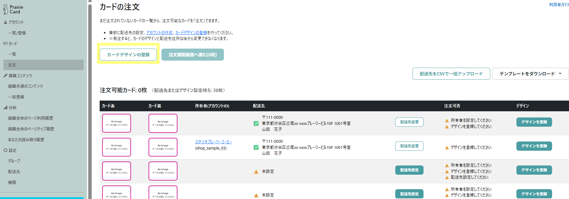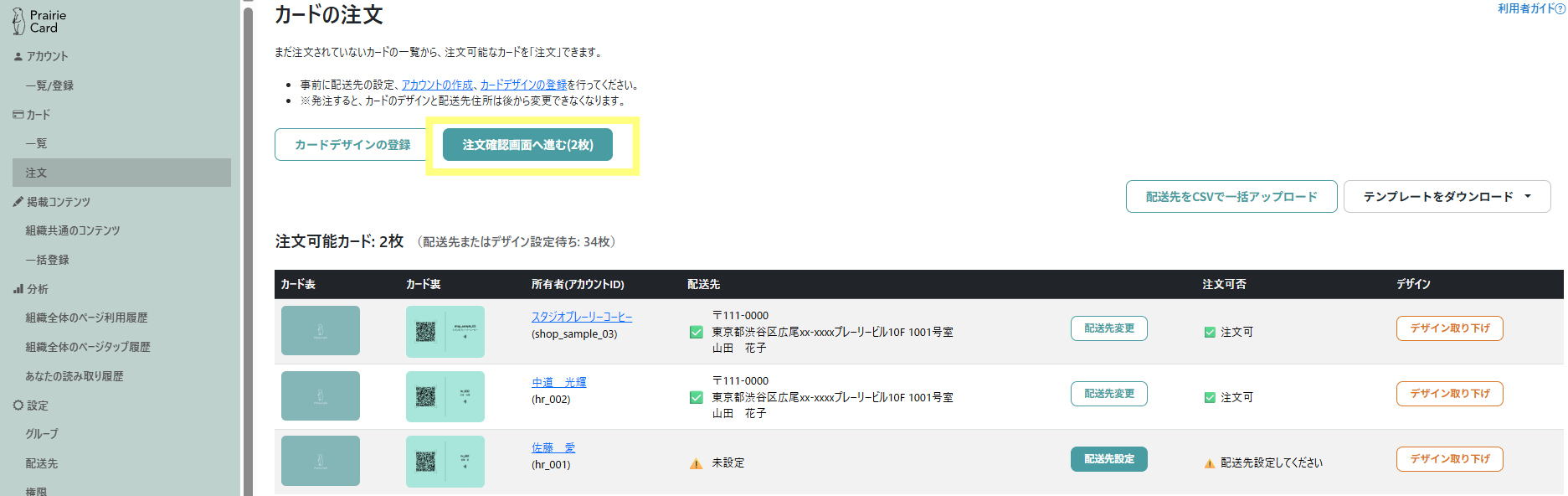 ※配送先未設定またはデザイン登録前のカードは注文に含まれません。