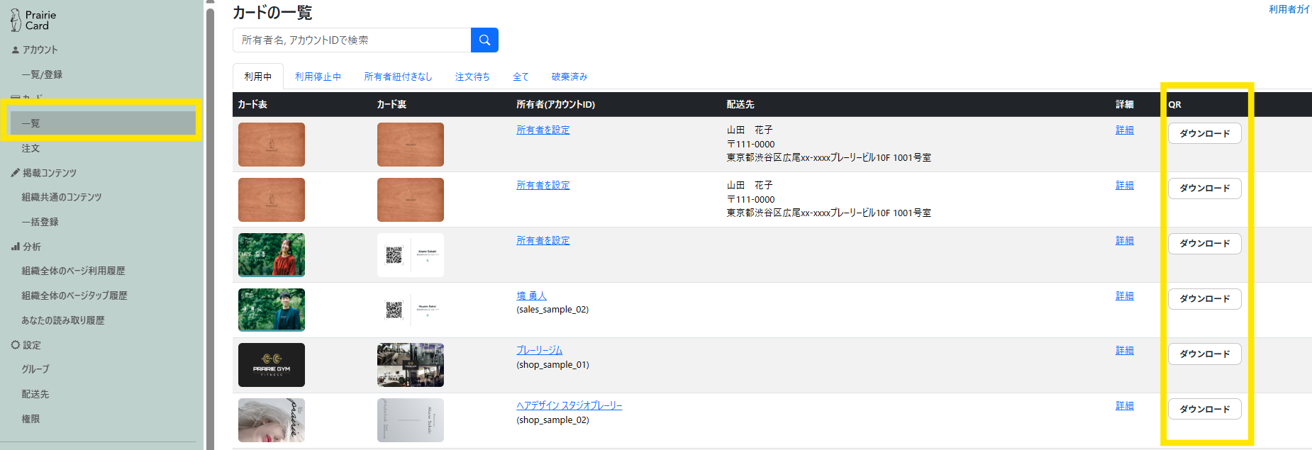 「カード」> 「一覧」> 「QR」> 「ダウンロード」