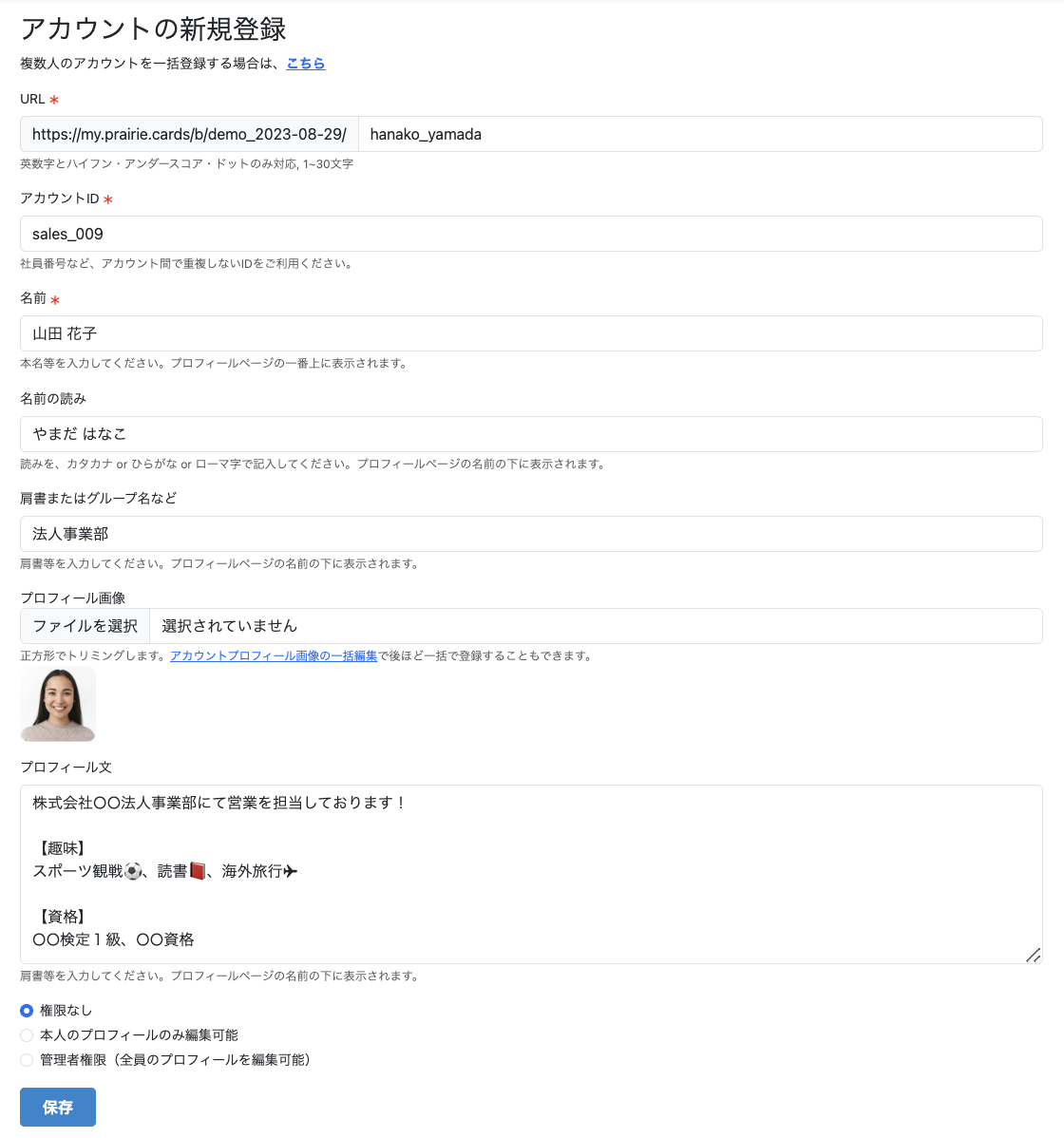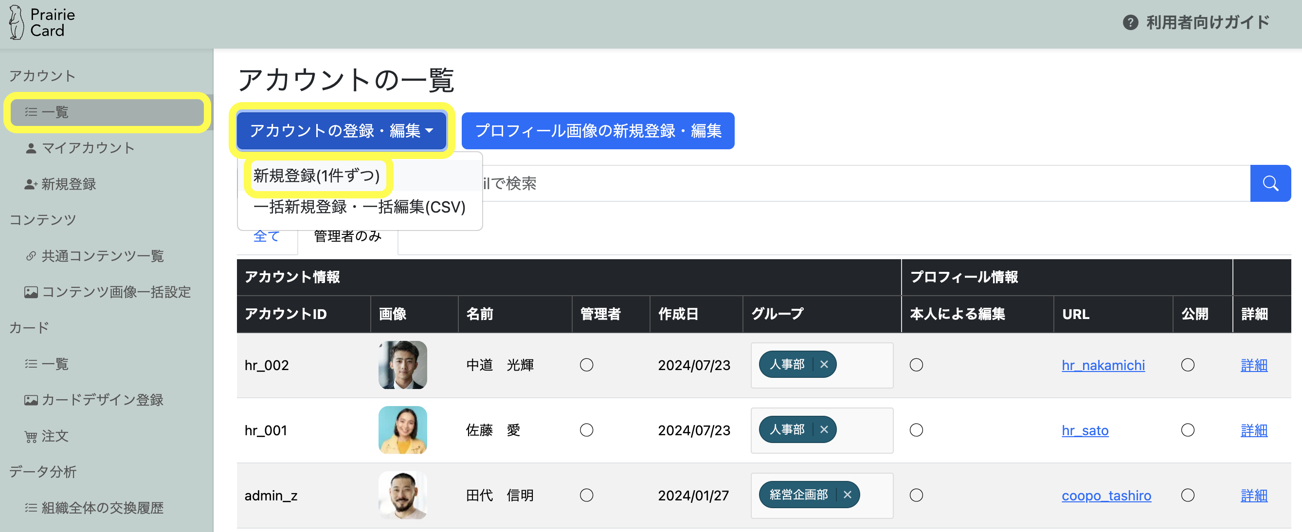 「アカウント」>「一覧」>「アカウントの登録・編集」>「新規登録(1件ずつ)」