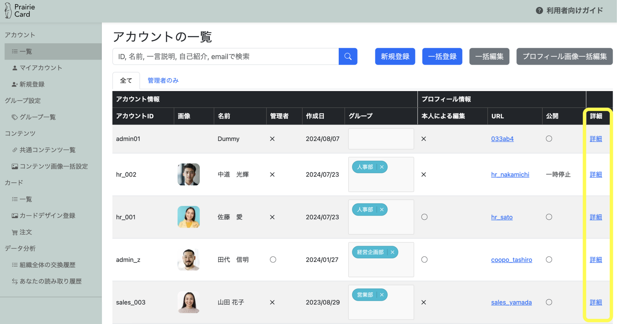 「アカウント」>「一覧」>「詳細」