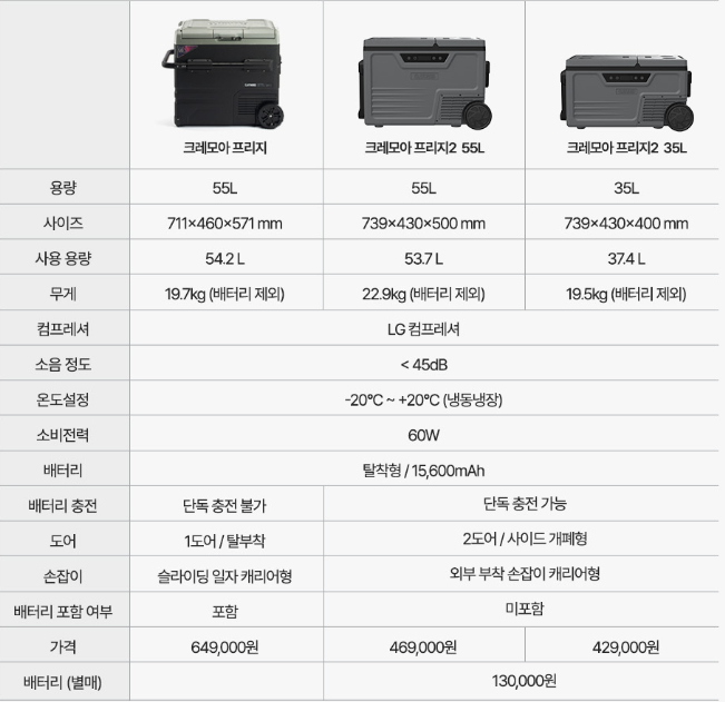 Q. 프리지 55L / 프리지2 35L / 프리지2 55L 차이점이 무엇인가요?