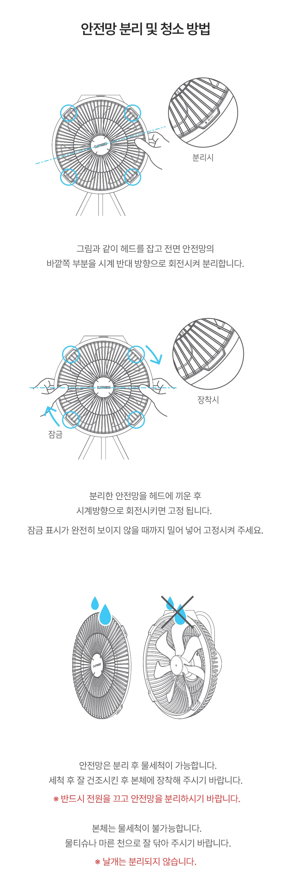 다만, 본체 및 날개는 분리 및 물세척이 불가하므로 마른 수건이나 천으로 닦은 뒤 완전히 건조 후 사용하는 것을 권장합니다.