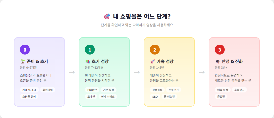 내 쇼핑몰이 어느 단계에 있는지 확인하고, 맞는 따라하기 영상을 선택해보세요.